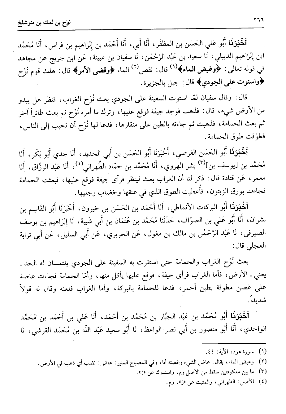 أخبرنا أبو علي الحسن بن المظفر أنا أبي أنااحمد بن إبراهيم بن فراس أنا محمد ابن إبراهيم الديبلي نا سعيد بن عبد الرحمن نا سفيان بن عيينة عن ابن جريج عن مجاهد في قوله تعالى " وغيض الماء " (1) قال نقص (2) الماء " وقضى الأمر " قال هلك قوم نوح " واستوت على الجودي " قال جبل بالجزيرة قال وقال سفيان لما استوت السفينة على الجودي بعث نوح الغراب فنظر هل يبدو من الأرض شئ قال فذهب فوجد جيفة فوقع عليها وترك ما أمره نوح ثم بعث طائرا آخر ثم بعث الحمامة فذهبت ثم جاءته بالطين على منقارها فدعا لها نوح أن تحبب إلى الناس فطوقت طوق الحمامة أخبرنا أبو الحسن الفرضي أخبرنا أبو الحسن بن أبي الحديد أنا جدي أبو بكر أنا محمد بن يوسف بن (3) بشر الهروي أنا محمد بن حماد الطهراني (4) أنا عبد الرزاق أنا معمر عن قتادة قال ذكر لنا أن الغراب بعث لينظر فرأى جيفة فوقع عليها فبعثت الحمامة فجاءت بورق الزيتون فأعطيت الطوق الذي في عنقها وخضاب رجليها أخبرنا أبو البركات الأنماطي أنا أحمد بن الحسن بن خيرون أخبرنا أبو القاسم بن بشران أنا أبو علي بن الصواف حدثنا محمد بن عثمان بن أبي شيبة نا إبراهيم بن يوسف الصيرفي نا عبد الرحمن بن مالك بن مغول عن الحريري عن أبي السليل عن أبي ترابة العجلي قال بعث نوح الغراب والحمامة حتى استقرت به السفينة على الجودي يلتمسان له الحد يعني الأرض فأما الغراب فرأى جيفة فوقع عليها يأكل منها وأما الحمامة فجاءت عاصة على غصن مطوقة بطين أحمر فدعا للحمامة بالبركة وأما الغراب فلعنه وقال له قولا شديدا أخبرنا أبو محمد بن عبد الجبار بن محمد بن احمد بن أنا علي بن أحمد بن محمد الواحدي أنا أبو منصور بن أبي نصر الواعظ نا أبو سعيد عبد الله بن محمد القرشي نا
