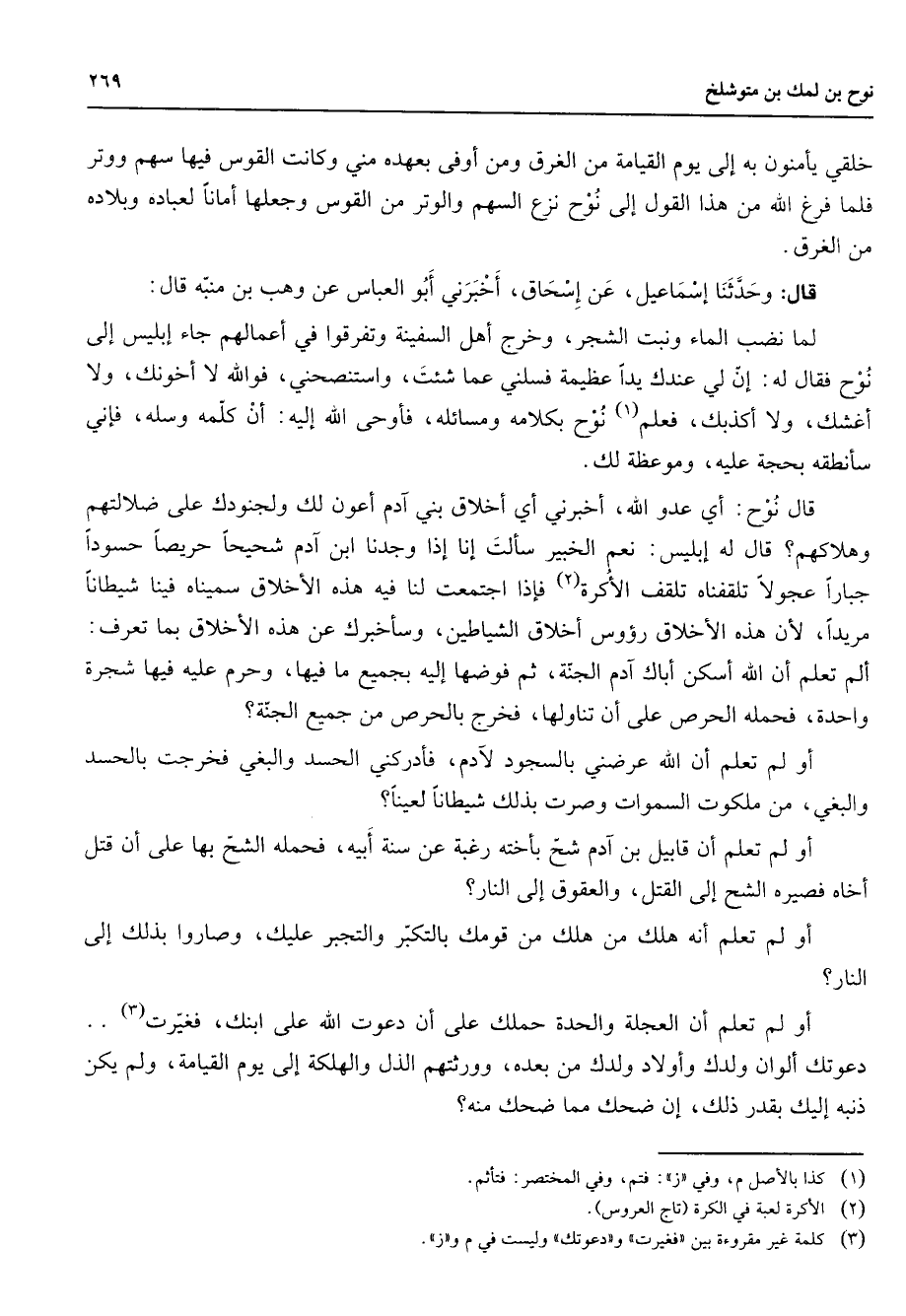 خلقي يأمنون به إلى يوم القيامة من الغرق ومن أوفى بعهده مني وكانت القوس فيها سهم ووتر فلما فرغ الله من هذا القول إلى نوح نزع السهم والوتر من القوس وجعلها أمانا لعباده وبلاده من الغرق قال وحدثنا إسماعيل عن إسحاق أخبرني أبو العباس عن وهب بن منبه قال لما نضب الماء ونبت الشجر وخرج أهل السفينة وتفرقوا في أعمالهم جاء إبليس إلى نوح فقال له إن لي عندك يدا عظيمة فسلني عما شئت واستنصحني فوالله لا أخونك ولا أغشك ولا أكذبك فعلم (1) نوح بكلامه ومسائله فأوحى الله إليه أن كلمه وسله فإني سأنطقه بحجة عليه وموعظة لك قال نوح أي عدو الله أخبرني أي أخلاق بني آدم أعون لك ولجنودك على ضلالتهم وهلاكهم قال له إبليس نعم الخبير سألت إنا إذا وجدنا ابن آدم شحيحا حريصا حسودا جبارا عجولا تلقفناه تلقف الأكرة (2) فإذا اجتمعت لنا فيه هذه الأخلاق سميناه فينا شيطانا مريدا لأن هذه الأخلاق رؤوس اخلاق الشياطين وسأخبرك عن هذه الأخلاق بما تعرف ألم تعلم أن الله اسكن أباك آدم الجنة ثم فوضها إليه بجميع ما فيها وحرم عليه فيها شجرة واحدة فحمله الحرص على أن تناولها فخرج بالحرص من جميع الجنة أو لم تعلم أن الله عرضني بالسجود لآدم فأدركني الحسد والبغي فخرجت بالحسد والبغي من ملكوت السموات وصرت بذلك شيطانا لعينا أو لم تعلم أن قابيل بن آدم شح بأخته رغبة عن سنة أبيه فحمله الشح بها على أن قتل أخاه فصيره الشح إلى القتل والعقوق إلى النار أو لم تعلم أنه هلك من هلك من قومك بالتكبر والتجبر عليك وصاروا بذلك إلى النار أو لم تعلم أن العجلة والحدة حملك على أن دعوت الله على ابنك فغيرت (3) دعوتك ألوان ولدك وأولاد ولدك من بعده وورثتهم الذل والهلكة إلى يوم القيامة ولم يكن ذنبه إليك بقدر ذلك إن ضحك مما ضحك منه