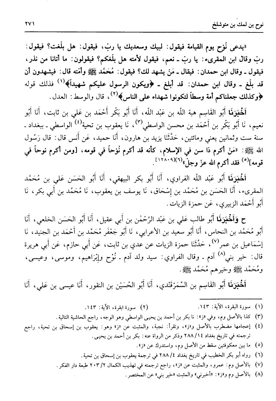 يدعي نوح يوم القيامة فيقول لبيك وسعديك يا رب فيقول هل بلغت فيقول رب وقال ابن المقرئ يا رب نعم فيقول لأمته هل بلغكم فيقولون ما اتانا من نذر فيقول وقال ابن حمدان فيقال من يشهد لك فيقول محمد (صلى الله عليه وسلم) وأمته قال فيشهدون أن قد أبلغ وقال ابن حمدان قد بلغ " ويكون الرسول عليكم شهيدا (1) " فذلك قوله وكذلك جعلناكم أمة وسطا لتكونوا شهداء على الناس (2) " قال والوسط العدل اخبرنا أبو القاسم هبة الله بن عبد الله أنا أبو بكر أحمد بن علي بن ثابت أنا أبو نعيم نا أبو بكر بن احمد بن محسن الواسطي (3) نا يعقوب بن تحية (4) الواسطي ببغداد سنة ست وثمانين يعني ومائتين حدثنا يزيد بن هارون أنا حميد عن انس قال قال رسول الله (صلى الله عليه وسلم) من أكرم ذا سن في الإسلام كأنه قد أكرم نوحا في قومه (5) ومن أكرم نوحا في قومه فقد أكرم الله عز وجل (6) اخبرنا أبو عبد الله الفراوي أنا أبو بكر البيهقي أنا أبو الحسن علي بن محمد المقرئ أنا الحسن بن محمد بن إسحاق نا يوسف بن يعقوب نا محمد بن أبي بكر نا أبو أحمد الزبيري عن حمزة الزيات ح اخبرنا أبو طالب علي بن عبد الرحمن بن أبي عقيل أنا أبو الحسن الخلعي أنا أبو محمد بن النحاس أنا أبو سعيد بن الأعرابي نا أبو جعفر محمد بن احمد بن الجنيد نا إسماعيل بن عمر (7) حدثنا حمزة الزيات عن عدي بن ثابت عن أبي حازم عن أبي هريرة قال خيربني (8) آدم وقال الفراوي سيد ولد آدم نوح وإبراهيم وموسى وعيسى ومحمد (صلى الله عليه وسلم) وخيرهم محمد (صلى الله عليه وسلم) أخبرنا أبو القاسم بن السمرقندي أنا أبو الحسين بن النقور أنا عيسى بن علي أنا