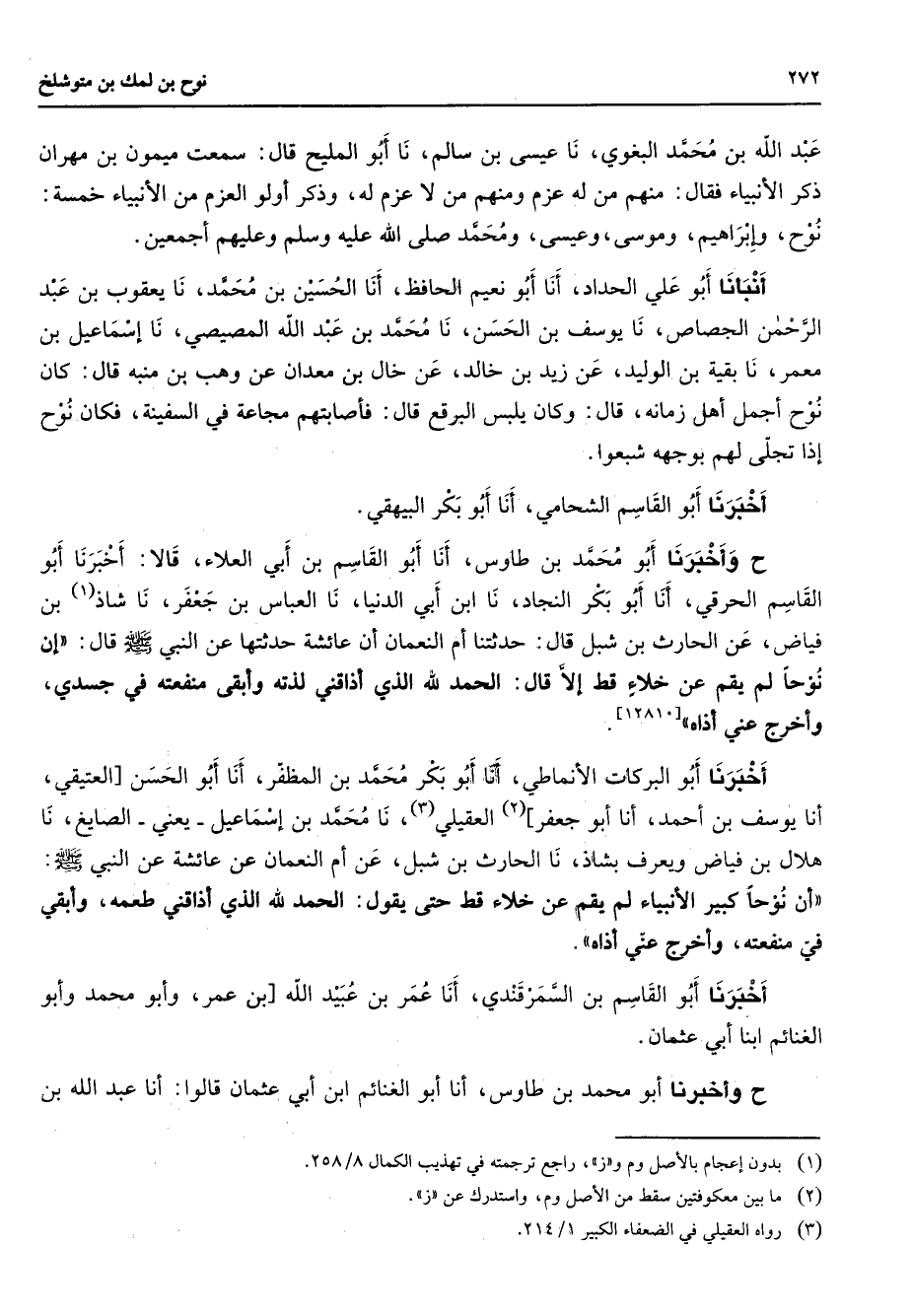 عبد الله بن محمد البغوي نا عيسى بن سالم نا أبو المليح قال سمعت ميمون بن مهران ذكر الأنبياء فقال منهم من له عزم ومنهم من لا عزم له وذكر أولو العزم من الأنبياء خمسة نوح وإبراهيم وموسى وعيسى ومحمد (صلى الله عليه وسلم) وعليهم أجمعين أنبأنا أبو علي الحداد أنا أبو نعيم الحافظ أنا الحسين بن محمد نا يعقوب بن عبد الرحمن الجصاص نا يوسف بن الحسن نا محمد بن عبد الله المصيصي نا إسماعيل بن معمر نا بقية بن الوليد عن زيد بن خالد عن خال بن معدان عن وهب بن منبه قال كان نوح أجمل أهل زمانه قال وكان يلبس البرقع قال فأصابتهم مجاعة في السفينة فكان نوح إذا تجلى لهم بوجهه شبعوا اخبرنا أبو القاسم الشحامي أنا أبو بكر البيهقي ح وأخبرنا أبو محمد بن طاوس أنا أبو القاسم بن ابي العلاء قالا أخبرنا أبو القاسم الحرقي أنا أبو بكر النجاد نا ابن أبي الدنيانا العباس بن جعفر نا شاذ (1) بن فياض عن الحارث بن شبل قال حدثتنا أم النعمان أن عائشة حدثتها عن النبي (صلى الله عليه وسلم) قال إن نوحا لم يقم عن خلاء قط إلا قال الحمد لله الذي أذاقني لذته وابقى منفعته في جسدي وأخرج عني أذاه اخبرنا أبو البركات الأنماطي أنا أبو بكر محمد بن المظفر أنا أبو الحسن العتيقي أنا يوسف بن أحمد أنا أبو جعفر (2) العقيلي (3) نا محمد بن إسماعيل يعني الصايغ نا هلال بن فياض ويعرف بشاذ نا الحارث بن شبل عن ام النعمان عن عائشة عن النبي (صلى الله عليه وسلم) أن نوحا كبير الأنبياء لم يقم عن خلاء قط حتى يقول الحمد لله الذي أذاقني طعمه وأبقي في منفعته وأخرج عني أذاه اخبرنا أبو القاسم بن السمرقندي أنا عمر بن عبيد الله بن عمر وأبو محمد وابو الغنائم ابنا أبي عثمان ح وأخبرنا أبو محمد بن طاوس أنا أبو الغنائم ابن أبي عثمان قالوا أنا عبد الله بن