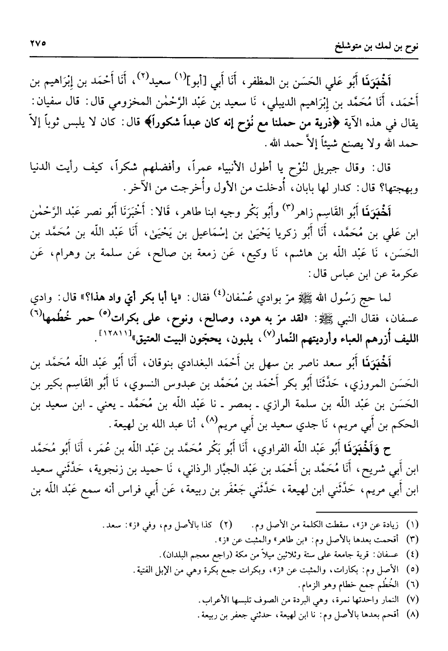 أخبرنا أبو علي الحسن بن المظفر أناابي أبو (1) سعيد (2) أنا أحمد بن إبراهيم بن احمد أنا محمد بن إبراهيم الديبلي نا سعيد بن عبد الرحمن المخزومي قال قال سفيان يقال في هذه الآية ذرية من حملنا مع نوح إنه كان عبدا شكورا " قال كان لا يلبس ثوبا إلا حمد الله ولا يصنع شيئا إلا حمد الله قال وقال جبريل لنوح يا أطول الأنبياء عمرا وأفضلهم شكرا كيف رأيت وبهجتها قال كدار لها بابان أدخلت من الأول وأخرجت من الآخر أخبرنا أبو القاسم زاهر (3) وأبو بكر وجيه ابنا طاهر قالا أخبرنا أبو نصر عبد الرحمن ابن علي بن محمد أنا أبو زكريا يحيى بن إسماعيل بن يحيى أنا عبد الله بن محمد بن الحسن نا عبد الله بن هاشم نا وكيع عن زمعة بن صالح عن سلمة بن وهرام عن عكرمة عن ابن عباس قال لما حج رسول الله (صلى الله عليه وسلم) مر بوادي عسفان (4) فقال يا أبا بكر أي واد هذا قال وادي عسفان فقال النبي (صلى الله عليه وسلم) لقد مر به هود وصالح ونوح على بكرات (5) حمر خطمها (6) الليف أزرهم العباء وأرديتهم (7) النمار يلبون يحجون البيت العتيق أخبرنا أبو سعد ناصر بن سهل بن احمد البغدادي بنوقان أنا أبو عبد الله محمد بن الحسن المروزي حدثنا أبو بكر أحمد بن محمد بن عبدوس النسوي نا أبو القاسم بكير بن الحسن بن عبد الله بن سلمة الرازي بمصر نا عبد الله بن محمد يعني ابن سعيد بن الحكم بن ابي مريم نا جدي سعيد بن أبي مريم (8) أنا عبد الله بن لهيعة ح وأخبرنا أبو عبد الله الفراوي أنا أبو بكر محمد بن عبد الله بن عمر أنا أبو محمد ابن أبي شريح أنا محمد بن أحمد بن عبد الجبار الرذاني نا حميد بن زنجويه حدثني سعيد ابن أبي مريم حدثني ابن لهيعة حدثني جعفر بن ربيعة عن أبي فراس أنه سمع عبد الله بن