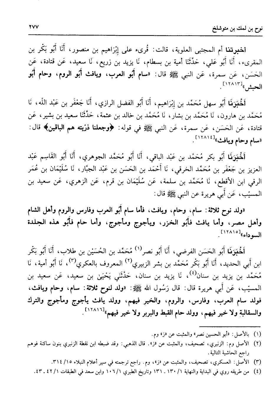 أخبرتنا أم المجتبى العلوية قالت قرئ على إبراهيم بن منصور أنا أبو بكر بن المقرئ أنا أبو علي حدثنا أمية بن بسطام نا يزيد بن زريع نا سعيد عن قتادة عن الحسن عن سمرة عن النبي (صلى الله عليه وسلم) قال سام أبو العرب ويافث أبو الروم وحام أبو الحبش أخبرنا أبو سهل محمد بن إبراهيم أنا أبو الفضل الرازي أنا جعفر بن عبد الله نا محمد بن هارون نا محمد بن بشار نا محمد بن خالد بن عثمة حدثنا سعيد بن بشير عن قتادة عن الحسن عن سمرة عن النبي (صلى الله عليه وسلم) في قوله " وجعلنا ذريته هم الباقين " قال سام وحام ويافث أخبرنا أبو بكر محمد بن عبد الباقي أنا أبو محمد الجوهري أنا أبو القاسم عبد العزيز بن جعفر بن محمد الخرقي نا احمد بن الحسن بن عبد الجبار نا سليمان بن عمر الرقي ابن الأقطع نا محمد بن سلمة عن سليمان بن قرم عن الزهري عن سعيد بن المسيب عن ابي هريرة عن النبي (صلى الله عليه وسلم) قال ولد نوح ثلاثة سام وحام ويافث فأما سام أبو العرب وفارس والروم وأهل الشام وأهل مصر وأما يافث فأبو الخزر ويأجوج ومأجوج واما حام فأبو هذه الجلدة السوداء أخبرنا أبو الحسن الفرضي أنا أبو نصر (1) محمد بن الحسين بن طلاب أنا أبو بكر ابن أبي الحديد أنا أبو بكر محمد بن بشر الزبيري (2) المعروف بالعكري (3) نا أبو أمية نا محمد بن يزيد بن سنان (4) نا يزيد بن سنان حدثني يحيى بن سعيد عن سعيد بن المسيب عن أبي هريرة قال قال رسول الله (صلى الله عليه وسلم) ولد لنوح ثلاثة سام وحام ويافث فولد سام العرب وفارس والروم والخير فيهم وولد يافث يأجوج ومأجوج والترك والسقالبة ولا خير فيهم وولد حام القبط والبربر ولا خير فيهم