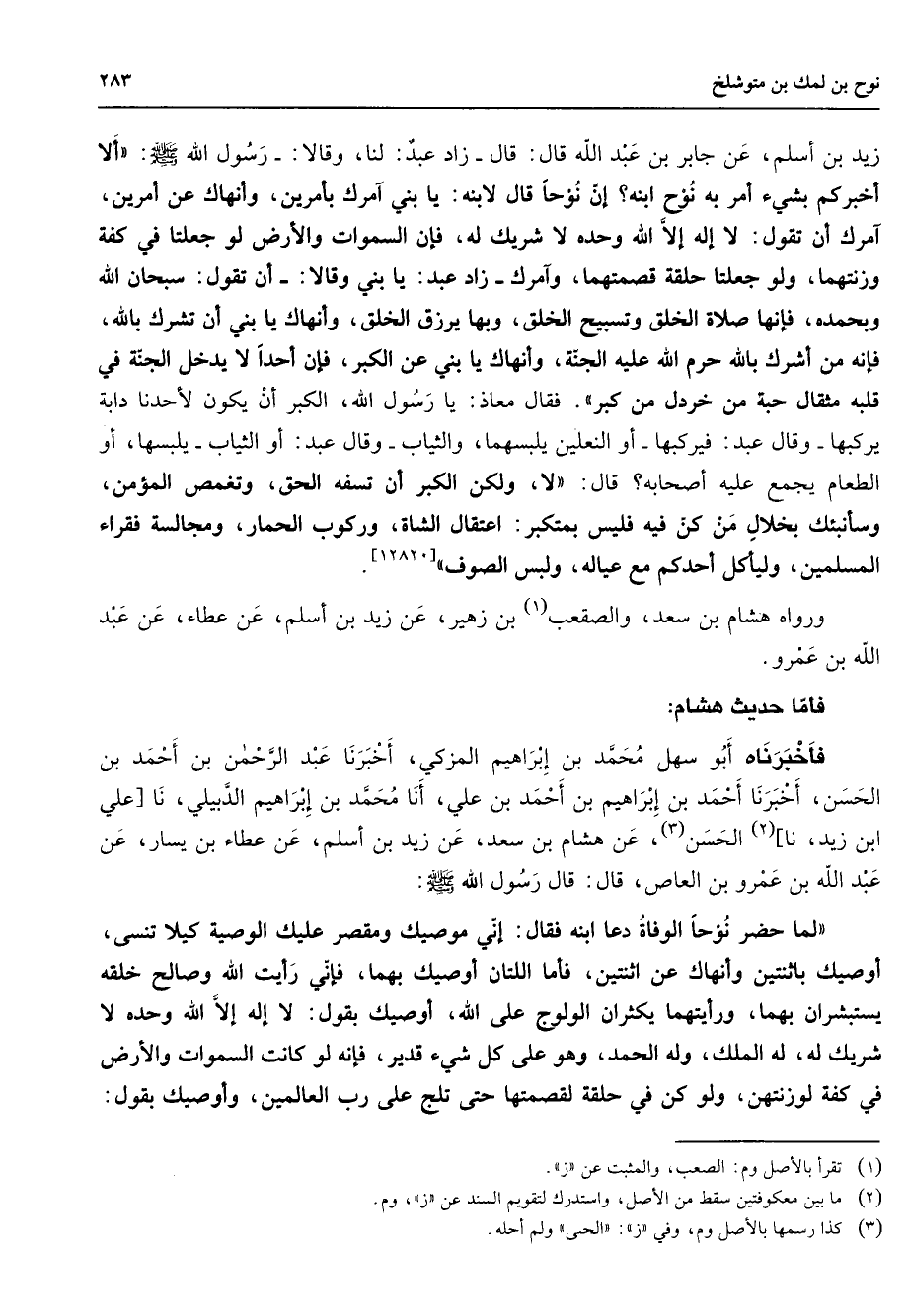 زيد بن أسلم عن جابر بن عبد الله قال قال زاد عبد لنا وقالا رسول الله (صلى الله عليه وسلم) ألا أخبركم بشئ أمر به نوح ابنه إن نوحا قال لابنه يا بني آمرك بأمرين وأنهاك عن أمرين آمرك أن تقول لا إله إلا الله وحده لا شريك له فإن السموات والأرض لو جعلتا في كفة وزنتهما ولو جعلتا حلقة قصمتهما وآمرك زاد عبد يا بني وقالا أن تقول سبحان الله وبحمده فإنها صلاة الخلق وتسبيح الخلق وبها يرزق الخلق وأنهاك يا بني أن تشرك بالله فإنه منأشرك بالله حرم الله عليه الجنة وأنهاك يا بني عن الكبر فإن أحدا لا يدخل الجنة في قلبه مثقال حبة من خردل من كبر فقال معاذ يا رسول الله الكبر أن يكون لأحدنا دابة يركبها وقال عبد فيركبها أو النعلين يلبسهما والثياب وقال عبد أو الثياب يلبسها أو الطعام يجمع عليه أصحابه قال لا ولكن الكبر أن تسفه الحق وتغمص المؤمن وسأنبئك بخلال من كن فيه فليس بمتكبر اعتقال الشاة وركوب الحمار ومجالسة فقراء المسلمين وليأكل أحدكم مع عياله ولبس الصوف ورواه هشام بن سعد والصقعب (1) بن زهير عن زيد بن اسلم عن عطاء عن عبد الله بن عمرو فأما حديث هشام فأخبرناه أبو سهل محمد بن إبراهيم المزكي أخبرنا عبد الرحمن بن احمد بن الحسن أخبرنا احمد بن إبراهيم بن أحمد بن علي أنا محمد بن إبراهيم الدبيلي نا علي ابن زيد نا (2) الحسن (3) عن هشام بن سعد عن زيد بن أسلم عن عطاء بن يسار عن عبد الله بن عمرو بن العاص قال قال رسول الله (صلى الله عليه وسلم) لما حضر نوحا الوفاة دعا ابنه فقال إني موصيك ومقصر عليك الوصية كيلا تنسى أوصيك باثنتين وأنهاك عن اثنتين فأما اللتان أوصيك بهما فإني رأيت الله وصالح خلقه يستبشران بهما ورأيتهما يكثران الولوج على الله أوصيك بقول لا إله إلا الله وحده لا شريك له له الملك وله الحمدوهو على كل شئ قدير فإنه لو كانت السموات والأرض في كفة لوزنتهن ولو كن في حلقة لقصمتها حتى تلج على رب العالمين وأوصيك بقول