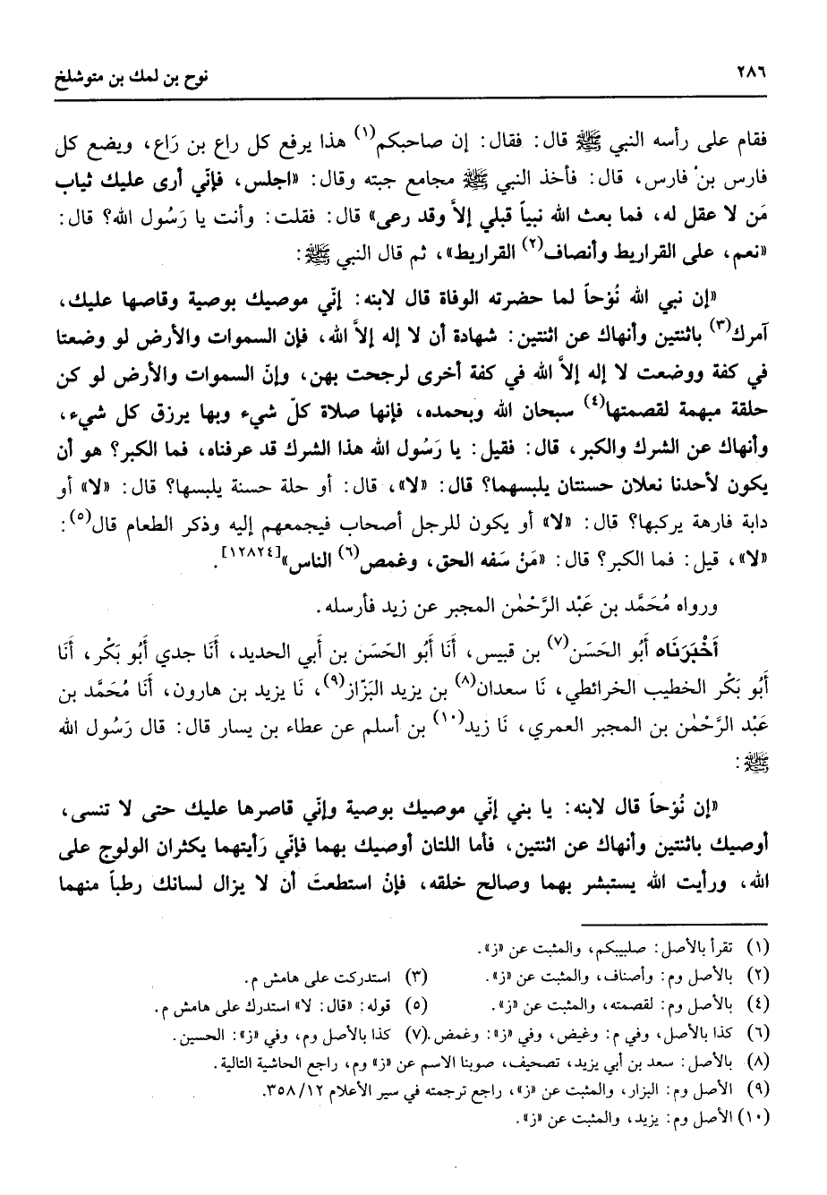فقام على رأسه النبي (صلى الله عليه وسلم) قال فقال إن صاحبكم (1) هذا يرفع كل راع بن راع ويضع كل فارس بن فارس قال فأخذ النبي (صلى الله عليه وسلم) مجامع جبته وقال اجلس فإني أرى عليك ثياب من لا عقل له فمابعث الله نبيا قبلي إلا وقد رعى قال فقلت وأنت يا رسول الله قال نعم على القراريط وأنصاف (2) القراريط ثم قال النبي (صلى الله عليه وسلم) إن نبي الله نوحا لما حضرته الوفاة قال لابنه إني موصيك بوصية وقاصها عليك آمرك (3) باثنتين وأنهاك عن اثنتين شهادة أن لا إله إلا الله فإن السموات والأرض لو وضعتا في كفة ووضعت لا إله إلا الله في كفة أخرى لرجحت بها وإن السموات والأرض لو كن حلقة مبهمة (4) لقصمتها سبحان الله وبحمده فإنها صلاة كل شئ وبها يرزق كل شئ وأنهاك عن الشرك والكبر قال فقيل يا رسول الله هذا الشرك قد عرفناه فما الكبر هو أن يكون لأحدنا نعلان حسنتان يلبسهما قال لا قال أو حلة حسنة يلبسها قال لا أو دابة فارهة يركبها قال لا أو يكون للرجل أصحاب فيجمعهم إليه وذكر الطعام قال (5) لا قيل فما الكبر قال من سفه الحق وغمص (6) الناس ورواه محمد بن عبد الرحمن المجبر عن زيد فأرسله أخبرناه أبو الحسن (7) بن قبيس أنا أبو الحسن بن أبي الحديد أنا جدي أبو بكر أنا أبو بكر الخطيب الخرائطي نا سعدان (8) بن يزيد البزار (9) نا يزيد بن هارون أنا محمد بن عبد الرحمن بن المجبر العمري نا زيد (10) بن أسلم عن عطاء بن يسار قال قال رسول الله (صلى الله عليه وسلم) إن نوحا قال لابنه يا بني إني موصيك بوصية وإني قاصرها عليك حتى لا تنسى أوصيك باثنتين وأنهاك عن اثنتين فاما اللتان أوصيك بهما فإني رأيتهما يكثران الولوج على الله ورأيت الله يستبشر بهما وصالح خلقه فإن استطعت أن لا يزال لسانك رطبا منهما