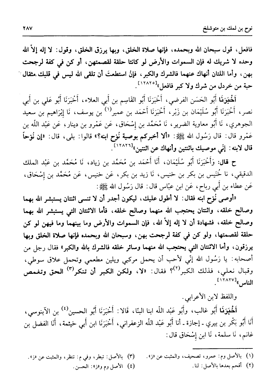 فافعل قول سبحان الله وبحمده فإنها صلاة الخلق وبها يرزق الخلق وقول لا إله إلا الله وحده لا شريك له فإن السموات والأرض لو كانتا حلقة لقصمتهن أو كن في كفة لرحجت بهن وأما اللتان أنهاك عنهما فالشرك والكبر فإن استطعت أن تلقى الله ليس في قلبك مثقال حبة من خردل من شرك ولا كبر فافعل أخبرنا أبو الحسن الفرضي أخبرنا أبو القاسم بن أبي العلاء أخبرنا أبو علي بن أبي نصر أخبرنا أبو سليمان بن زبر أخبرنا أحمد بن عمير (1) بن يوسف نا إبراهيم بن سعيد الجوهري نا أبو معاوية الضرير نا محمد بن إسحاق عن عمرو بن دينار عن عبد الله بن عمرو قال قال رسول الله (صلى الله عليه وسلم) ألا أخبركم بوصية نوح ابنه قالوا بلى قال إن نوحا قال لابنه إني موصيك باثنتين وأنهاك عن اثنتين ح قال وأخبرنا أبو سليمان أنا أحمد بن محمد بن زياد نا محمد بن عبد الملك الدقيقي نا خنيس بن بكر بن خنيس نا زيد بن بكر عن خنيس عن محمد بن إسحاق عن عطاء بن أبي رباح عن ابن عباس قال قال رسول الله (صلى الله عليه وسلم) أوصى نوح ابنه فقال لا أطول عليك ليكون أجدر أن لا تنسى اثنتان يستبشر الله بهما وصالح خلقه واثنتان يحتجب الله منهما وصالح خلقه فأما الاثنتان التي يستبشر الله بهما وصالح خلقه فشهادة أن لا إله إلا الله فإن السموات والأرض وما بينهما ما فيهن لوكن حلقة لقصمتها ولو كن في كفة لرجحت بهن وسبحان الله وبحمده فإنها صلاة الخلق وبها يرزقون وأما الاثنتان التي يحتجب الله منهما وسائر خلقه فالشرك بالله والكبر فقال رجل من أصحابه يا رسول الله إني لأحب أن يحمل مركبي ويلين مطعمي وتحمل علاق سوطي وقبال نعلي فذلك الكبر (2) فقال لا ولكن الكبر أن تنكر (3) الحق وتغمص الناس واللفظ لابن الأعرابي أخبرنا أبو غالب وأبو عبد الله ابنا البنا قالا أخبرنا أبو الحسين (4) بن الآبنوسي أنا أبو بكر بن بيري إجازة أنا أبو عبد الله الزعفراني أخبرنا ابن أبي خيثمة أنا الفضل بن غانم نا سلمة نا ابن إسحاق قال