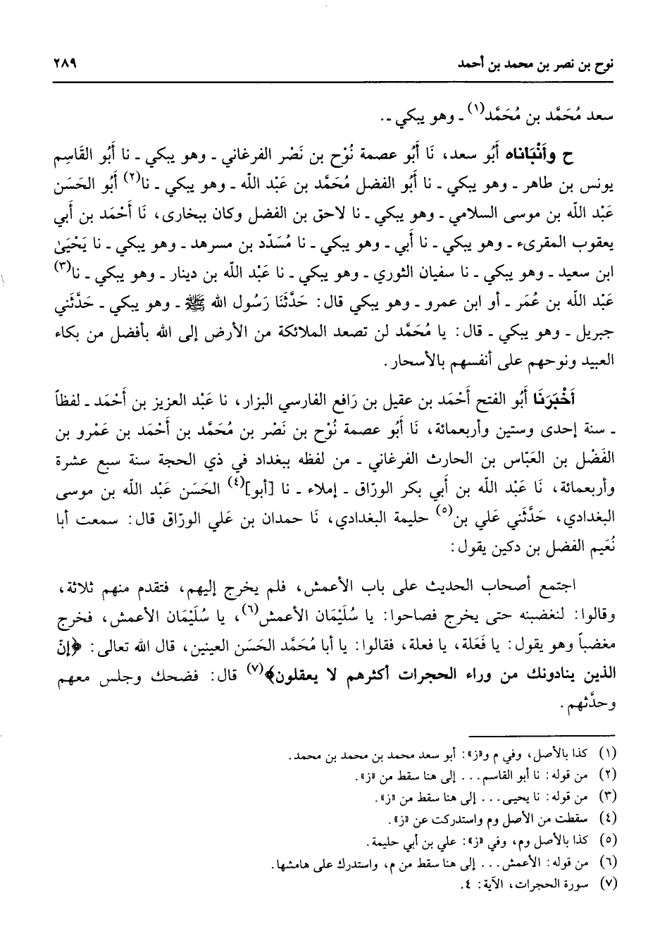 سعد محمد بن محمد (1) وهو يبكي ح وأنبأناه أبو سعد نا أبو عصمة نوح بن نصر الفرغاني وهو يبكي نا أبو القاسم يونس بن طاهر وهو يبكي نا أبو الفضل محمد بن عبد الله وهو يبكي (2) نا أبو الحسن عبد الله بن موسى السلامي وهو يبكي نا لاحق بن الفضل وكان ببخارى نا أحمد بن ابي يعقوب المقرئ وهو يبكي نا أبي وهو يبكي نا مسدد بن مسرهد وهو يبكي نا يحيى ابن سعيد وهو يبكي نا سفيان الثوري وهو يبكي نا عبد الله بن دينار وهو يبكي نا (3) عبد الله بن عمر أو ابن عمرو وهو يبكي قال حدثنا رسول الله (صلى الله عليه وسلم) وهو يبكي حدثني جبريل وهو يبكي قال يا محمد لن تصعد الملائكة من الأرض إلى الله بأفضل من بكاء العبيد ونوحهم على أنفسهم بالأسحار أخبرنا أبو الفتح أحمد بن عقيل بن رافع الفارسي البزار نا عبد العزيز بن أحمد لفظا سنة إحدى وستين وأربعمائة نا أبو عصمة نوح بن نصر بن محمد بن أحمد بن عمرو بن الفضل بن العباس بن الحارث الفرغاني من لفظه ببغداد في ذي الحجة سنة سبع عشرة وأربعمائة نا عبد الله بن أبي بكر الوراق إملاء نا أبو (4) الحسن عبد الله بن موسى البغدادي حدثني علي بن (5) حليمة البغدادي نا حمدان بن علي الوراق قال سمعت أبا نعيم الفضل بن دكين يقول اجتمع أصحاب الحديث على باب الأعمش فلم يخرج إليهم فتقدم منهم ثلاثة وقالوا لنغضبنه حتى يخرج فصاحوا يا سليمان الأعمش يا سليمان الأعمش (6) فخرج مغضبا وهو يقول يا فعلة يا فعلة فقالوا يا أبا محمد الحسن العينين قال الله تعالى " إن الذين ينادونك من وراء الحجرات أكثرهم لا يعقلون (7) " قال فضحك وجلس معهم وحدثهم