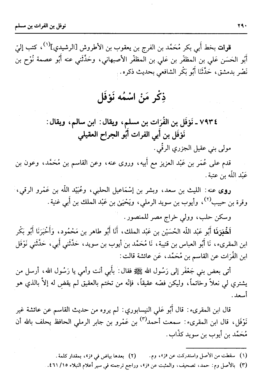 قرأت بخط أبي بكر محمد بن الفرج بن يعقوب بن الأطروش الرشيدي (1) كتب إلي أبو الحسن علي بن المظفر بن علي بن المظفر الأصبهاني وحدثني عنهابو عصمة نوح بن نصر بدمشق حدثنا أبو بكر الشافعي بحديث ذكره " ذكر من اسمه نوفل "