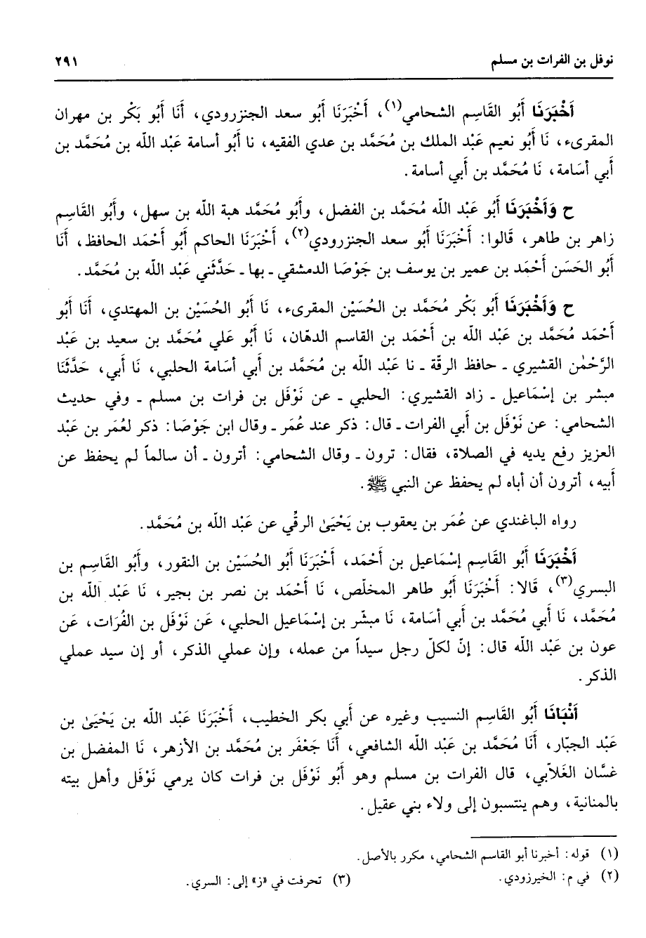 أخبرنا أبو القاسم الشحامي (1) أخبرنا أبو سعد الجنزرودي أنا أبو بكر بن مهران المقرئ نا أبو نعيم عبد الملك بن محمد بن عدي الفقيه نا أبو أسامة عبد الله بن محمد بن أبي أسامة نا محمد بن أبي أسامة ح وأخبرنا أبو عبد الله محمد بن الفضل وأبو محمد هبة الله بن سهل وابو القاسم زاهر بن طاهر قالوا أخبرنا أبو سعد الجنزرودي (2) أخبرنا الحاكم أبو أحمد الحافظ أنا أبو الحسن أحمد بن عمير بن يوسف بن جوصا الدمشقي بها حدثني عبد الله بن محمد ح وأخبرنا أبو بكر محمد بن الحسين المقرئ نا أبو الحسين بن المهتدي أنا أبو أحمد محمد بن عبد الله بن احمد بن القاسم الدهان نا أبو علي محمد بن سعيد بن عبد الرحمن القشيري حافظ الرقة نا عبد الله بن محمد بن أبي أسامة الحلبي نا ابي حدثنا مبشر بن إسماعيل زاد القشيري الحلبي عن نوفل بن فرات بن مسلم وفي حديث الشحامي عن نوفل بن ابي الفرات قال ذكر عند عمر وقال ابن جوصا ذكر لعمر بن عبد العزيز رفع يديه في الصلاة فقال ترون وقال الشحامي أترون أنا سالما لم يحفظ عن أبيه أترون أن أباه لم يحفظ عن النبي (صلى الله عليه وسلم) رواه الباغندي عن عمر بن يعقوب بن يحيى الرقي عن عبد الله بن محمد أخبرنا أبو القاسم إسماعيل بن أحمد أخبرنا أبو الحسين بن النقور وأبو القاسم بن البسري (3) قالا أخبرنا أبو طاهر المخلص نا أحمد بن نصر بن بجير نا عبد الله بن محمد نا أبي محمد بن أبي أسامة نا مبشر بن إسماعيل الحلبي عن نوفل بن الفرات عن عون بن عبد الله قال إن لكل رجل سيدا من عمله وإن عملي الذكر أو إن سيد عملي الذكر أنبأنا أبو القاسم النسيب وغيره عن أبي بكر الخطيب أخبرنا عبد الله بن يحيى بن عبد الجبار أنا محمد بن عبد الله الشافعي أنا جعفر بن محمد بن الأزهر نا المفضل بن غسان الغلابي قال الفرات بن مسلم وهو أبو نوفل بن فرات كان يرمي نوفل وأهل بيته بالمنانية وهم ينتسبون إلى ولاء بني عقيل