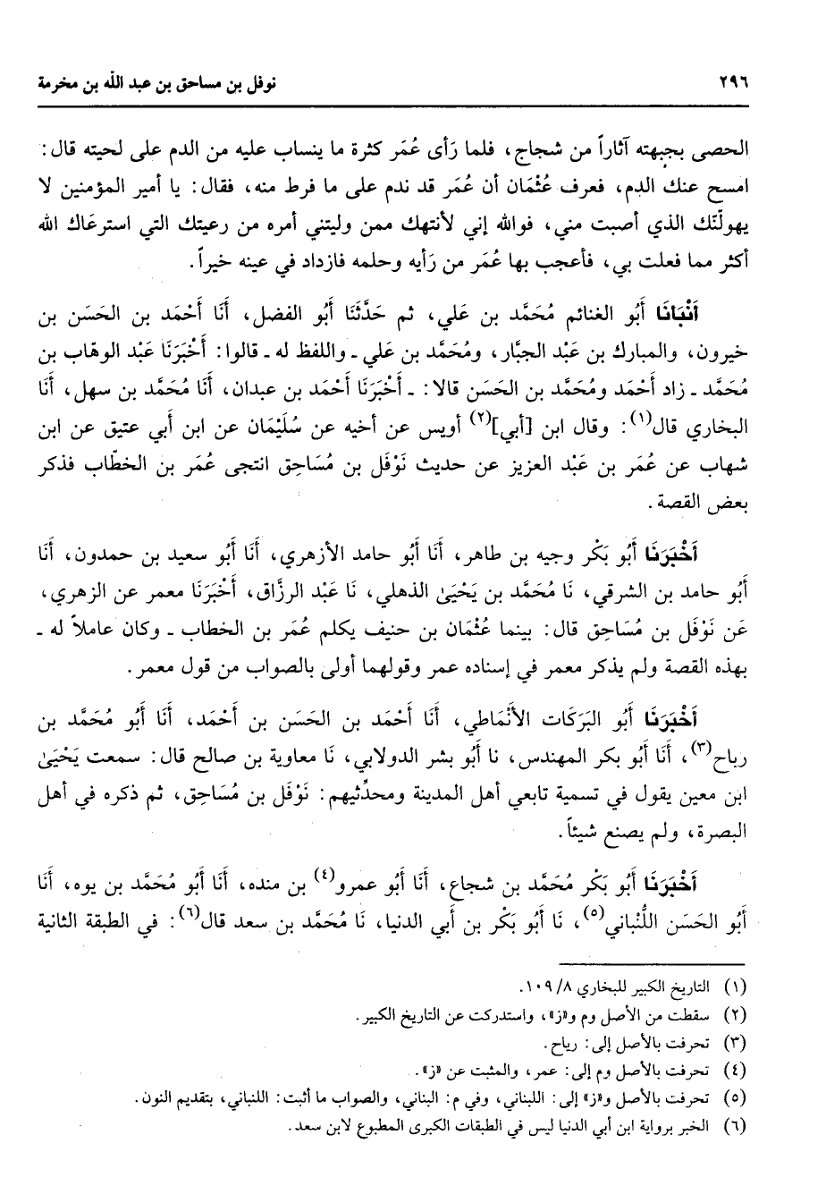 الحصى بجبهته آثارا من شجاج فلما رأى عمر كثرة ما ينساب عليه من الدم على لحيته قال امسح عنك الدم فعرف عثمان أن عمر قد ندم على ما فرط منه فقال يا أمير المؤمنين لا يهولنك الذي أصبت مني فوالله إني لأنتهك ممن وليتني أمره من رعيتك التي استرعاك الله أكثر مما فعلت بي فأعجب بها عمر من رأيه وحلمه فازداد في عينه خيرا أنبأنا أبو الغنائم محمد بن علي ثم حدثنا أبو الفضل أنا أحمد بن الحسن بن خيرون والمبارك بن عبد الجبار ومحمد بن علي واللفظ له قالوا أخبرنا عبد الوهاب بن محمد زاد أحمد ومحمد بن الحسن قالا أخبرنا أحمد بن عبدان أنا محمد بن سهل أنا البخاري قال (1) وقال ابن أبي (2) أويس عن أخيه عن سليمان عن ابن أبي عتيق عن ابن شهاب عن عمر بن عبد العزيز عن حديث نوفل بن مساحق انتجى عمر بن الخطاب فذكر بعض القصة أخبرنا أبو بكر وجيه بن طاهر أنا أبو حامد الأزهري أنا أبو سعيد بن حمدون أنا أبو حامد بن الشرقي نا محمد بن يحيى الذهلي نا عبد الرزاق أخبرنا معمر عن الزهري عن نوفل بن مساحق قال بينما عثمان بن حنيف يكلم عمر بن الخطاب وكان عاملا له بهذه القصة ولم يذكر معمر في إسناده عمر وقولهما أولى بالصواب من قول معمر اخبرنا أبو البركات الأنماطي أنا أحمد بن الحسن بن احمد أنا أبو محمد بن (3) رباح أنا أبو بكر المهندس نا أبو بشر الدولابي نا معاوية بن صالح قال سمعت يحيى ابن معين يقول في تسمية تابعي أهل المدينة ومحدثيهم نوفل بن مساحق ثم ذكره في أهل البصرة ولم يصنع شيئا أخبرنا أبو بكر محمد بن شجاع أنا أبو عمرو (4) بن منده أنا أبو محمد بن يوه أنا أبو الحسن اللنباني (5) نا أبو بكر بن أبي الدنيا نا محمد بن سعد قال (6) في الطبقة الثانية