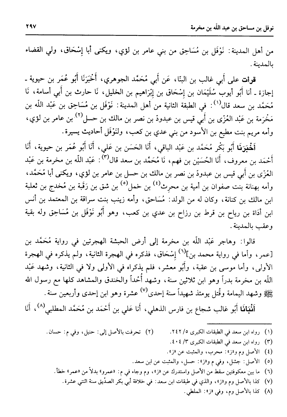من أهل المدينة نوفل بن مساحق من بني عامر بن لؤي ويكنى أبا إسحاق ولي القضاء بالمدينة قرأت على أبي غالب بن البنا عن أبي محمد الجوهري أخبرنا أبو عمر بن حيوية إجازة أنا أبو ايوب سليمان بن إسحاق بن إبراهيم بن الخليل نا حارث بن أبي أسامة نا محمد بن سعد قال (1) في الطبقة الثانية من اهل المدينة نوفل بن مساحق بن عبد الله بن مخرمة بن عبد العزى بن أبي قيس بن عبدود بن نصر بن مالك بن حسل (2) بن عامر بن لؤي وأمه مريم بنت مطيع بن الأسود من بني عدي بن كعب ولنوفل أحاديث يسيرة أخبرنا أبو بكر محمد بن عبد الباقي أنا الحسن بن علي أنا أبو عمر بن حيوية أنا احمد بن معروف أنا الحسين بن فهم نا محمد بن سعد قال (3) عبد الله بن مخرمة بن عبد العزى بن أبي قيس بن عبدود بن نصر بن مالك بن حسل بن عامر بن لؤي ويكنى ابا محمد وأمه بهنانة بنت صفوان بن أمية بن محرث (4) بن خمل (5) بن شق بن رقبة بن مخدج بن ثعلبة ابن مالك بن كنانة وكان له من الولد مساحق وأمه زينب بنت سراقة بن المعتمد بن أنس ابن أداة بن رياح بن قرط بن رزاح بن عدي بن كعب وهو أبو نوفل بن مساحق وله بقية وعقب بالمدينة قالوا وهاجر عبد الله بن مخرمة إلى أرض الحبشة الهجرتين في رواية محمد بن عمر وأما في رواية محمد بن (6) إسحاق فذكره في الهجرة الثانية ولم يذكره في الهجرة الأولى وأما موسى بن عقبة وابو معشر فلم يذكراه في الأولى ولا في الثانية وشهد عبد الله بن مخرمة بدرا وهو ابن ثلاثين سنة وشهد أحدا والخندق والمشاهد كلها مع رسول الله (صلى الله عليه وسلم) وشهد اليمامة وقتل يومئذ شهيدا سنة إحدى (7) عشرة وهو ابن إحدى وأربعين سنة أنبأنا أبو غالب شجاع بن فارس الذهلي أنا علي بن احمد بن محمد المطلبي (8) أنا