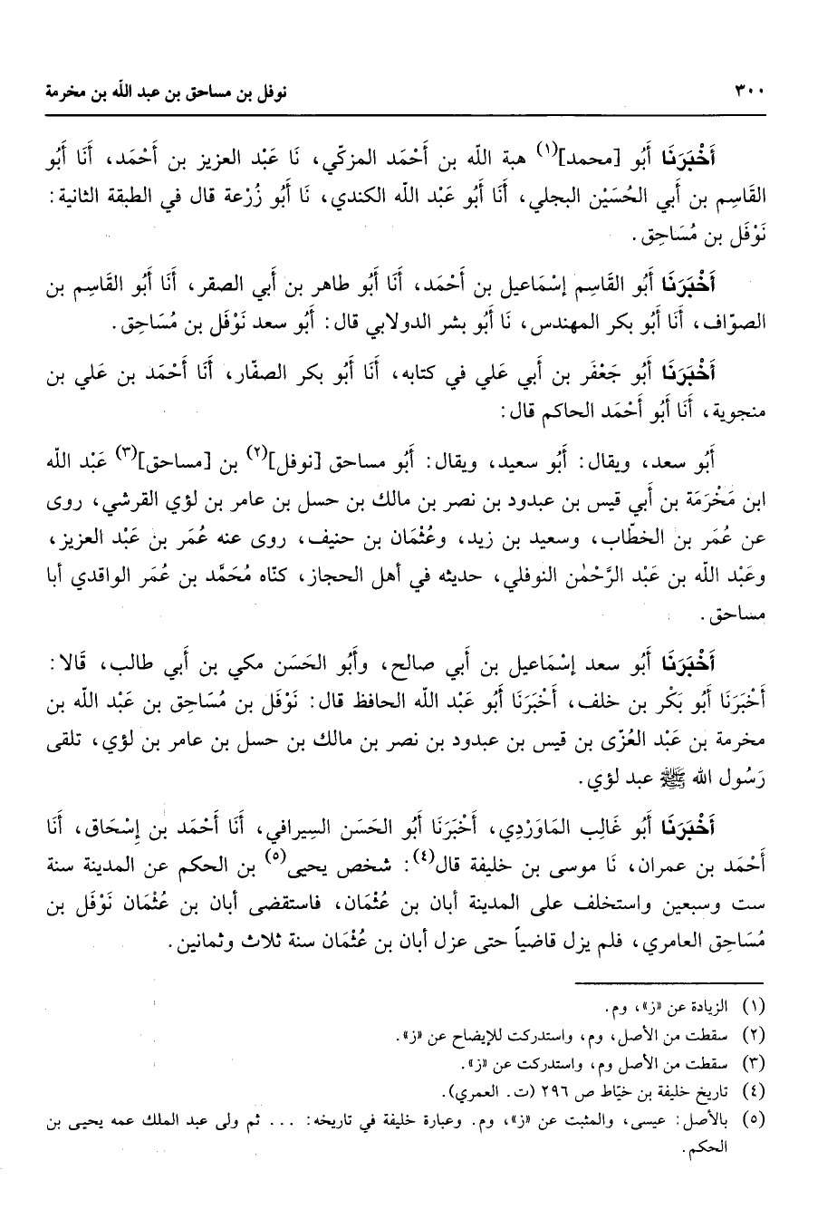 أخبرنا أبو محمد (1) هبة الله بن أحمد المزكي نا عبد العزيز بن أحمد أنا أبو القاسم بن أبي الحسين البجلي أنا أبو عبد الله الكندي نا أبو زرعة قال في الطبقة الثانية نوفل بن مساحق أخبرنا أبو القاسم إسماعيل بن أحمد أنا أبو طاهر بن أبي الصقر أنا أبو القاسم بن الصواف أنا أبو بكر المهندس نا أبو بشر الدولابي قال أبو سعد نوفل بن مساحق أخبرنا أبو جعفر بن أبي علي في كتابه أناابي بكر الصفار أنا أحمد بن علي بن منجوية أنا أبو أحمد الحاكم قال أبو سعد ويقال أبو سعيد ويقال أبو مساحق نوفل (2) بن مساحق (3) عبد الله ابن مخرمة بن أبي قيس بن عبدود بن نصر بن مالك بن حسل بن عامر بن لؤي القرشي روى عن عمر بن الخطاب وسعيد بن زيد وعثمان بن حنيف روى عنه عمر بن عبد العزيز وعبد الله بن عبد الرحمن النوفلي حديثه في أهل الحجاز كناه محمد بن عمر الواقدي أبا مساحق أخبرنا أبو سعد إسماعيل بن أبي صالح وابو الحسن مكي بن أبي طالب قالا أخبرنا أبو بكر بن خلف أخبرنا أبو عبد الله الحافظ قال نوفل بن مساحق بن عبد الله بن مخرمة بن عبد العزى بن قيس بن عبدود بن نصر بن مالك بن حسل بن عامر بن لؤي تلقى رسول الله (صلى الله عليه وسلم) عبد لؤي أخبرنا أبو غالب الماوردي أخبرنا أبو الحسن السيرافي أنا أحمد بن إسحاق أنا احمد بن عمران نا موسى بن خليفة قال (4) شخص يحيى (5) بن الحكم عن المدينة سنة ست وسبعين واستخلف على المدينة أبان بن عثمان فاستقضى أبان بن عثمان نوفل بن مساحق العامري فلم يزل قاضيا حتى عزل أبان بن عثمان سنة ثلاث وثمانين