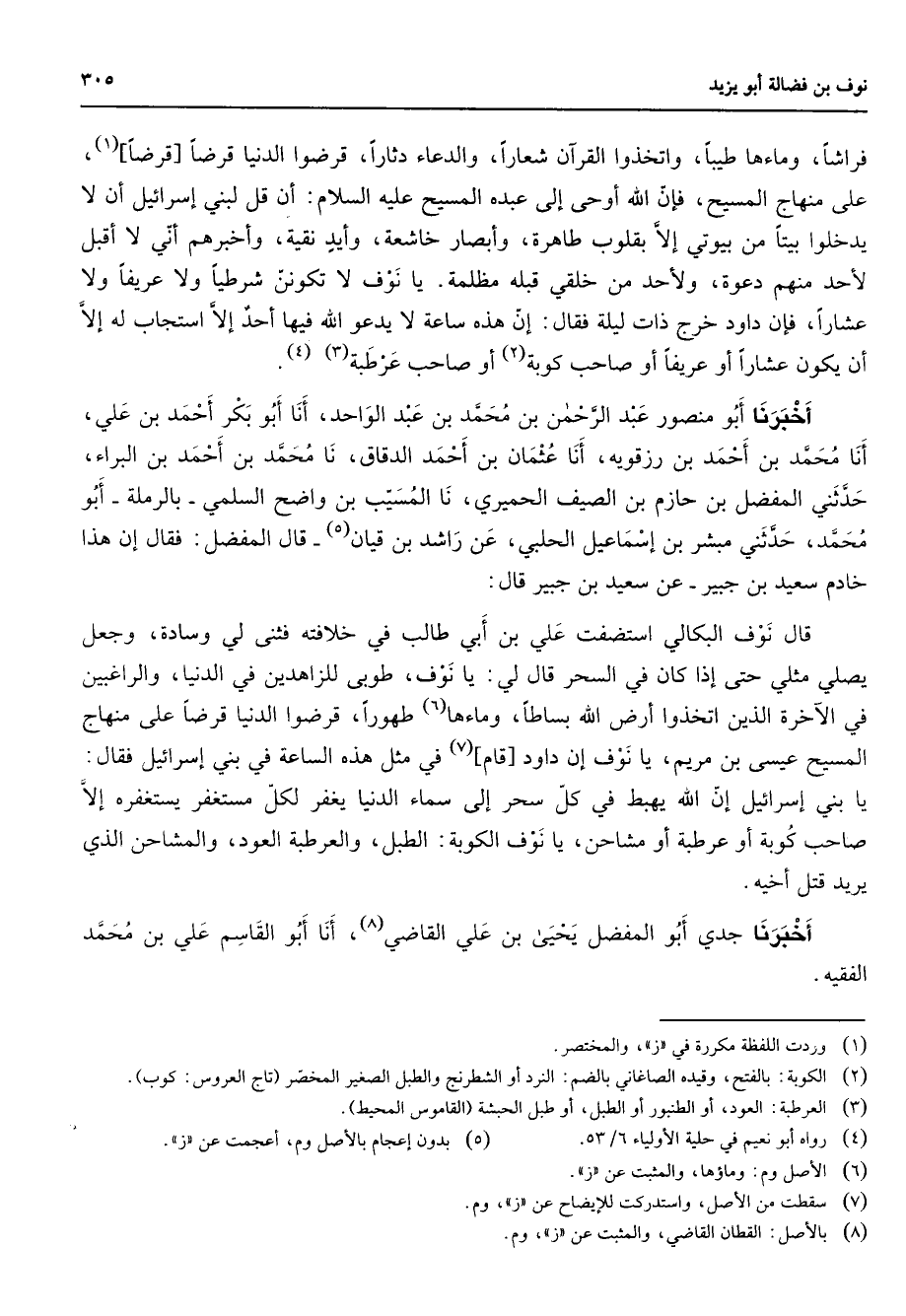 فراشا وماءها طيبا واتخذوا القرآن شعارا والدعاء دثارا قرضوا الدنيا قرضا قرضا (1) على منهاج المسيح فإن الله أوحى إلى عبده المسيح عليه السلام أن قل لبني إسرائيل أن لا يدخلوا بيتا من بيوتي إلا بقلوب طاهرة وأبصار خاشعة وايد نقية وأخبرهم أني لا أقبل لأحد منهم دعوة ولأحد من خلقي قبله مظلمة يا نوف لا تكونن شرطيا ولا عريفا ولا عشارا فإن داود خرج ذات ليلة فقال إن هذه ساعة لا يدعو الله فيها أحد إلا استجاب له إلا أن يكون عشارا أو عريفا أو صاحب كوبة (2) أو صاحب عرطبة (3) (4) أخبرنا أبو منصور عبد الرحمن بن محمد بن عبد الواحد أنا أبو بكر أحمد بن علي أنا محمد بن احمد بن رزقويه أنا عثمان بن أحمد الدقاق نا محمد بن أحمد بن البراء حدثني المفضل بن حازم بن الصيف الحميري نا المسيب بن واضح السلمي بالرملة أبو محمد حدثني مبشر بن إسماعيل الحلبي عن راشد بن قيان (5) قال المفضل فقال إن هذا خادم سعيد بن جبير عن سعيد بن جبير قال قال نوف البكالي استضفت علي بن أبي طالب في خلافته فثنى لي وسادة وجعل يصلي مثلي حتى إذا كان في السحر قال لي يا نوف طوبى للزاهدين في الدنيا والراغبين في الآخرة الذين اتخذوا أرض الله بساطا وماءها (6) طهورا قرضوا الدنيا قرضا على منهاج المسيح عيسى بن مريم يا نوف إن داود قام (7) في مثل هذه الساعة في بني إسرائيل فقال يا بني إسرائيل إن الله يهبط في كل سحر إلى سماء الدنيا يغفر لكل مستغفر يستغفره إلا صاحب كوبة أو عرطبة أو مشاحن يا نوف الكوبة الطبل والعرطبة العود والمشاحن الذي يريد قتل أخيه أخبرنا جدي أبو المفضل يحيى بن علي القاضي (8) أنا أبو القاسم علي بن محمد الفقيه