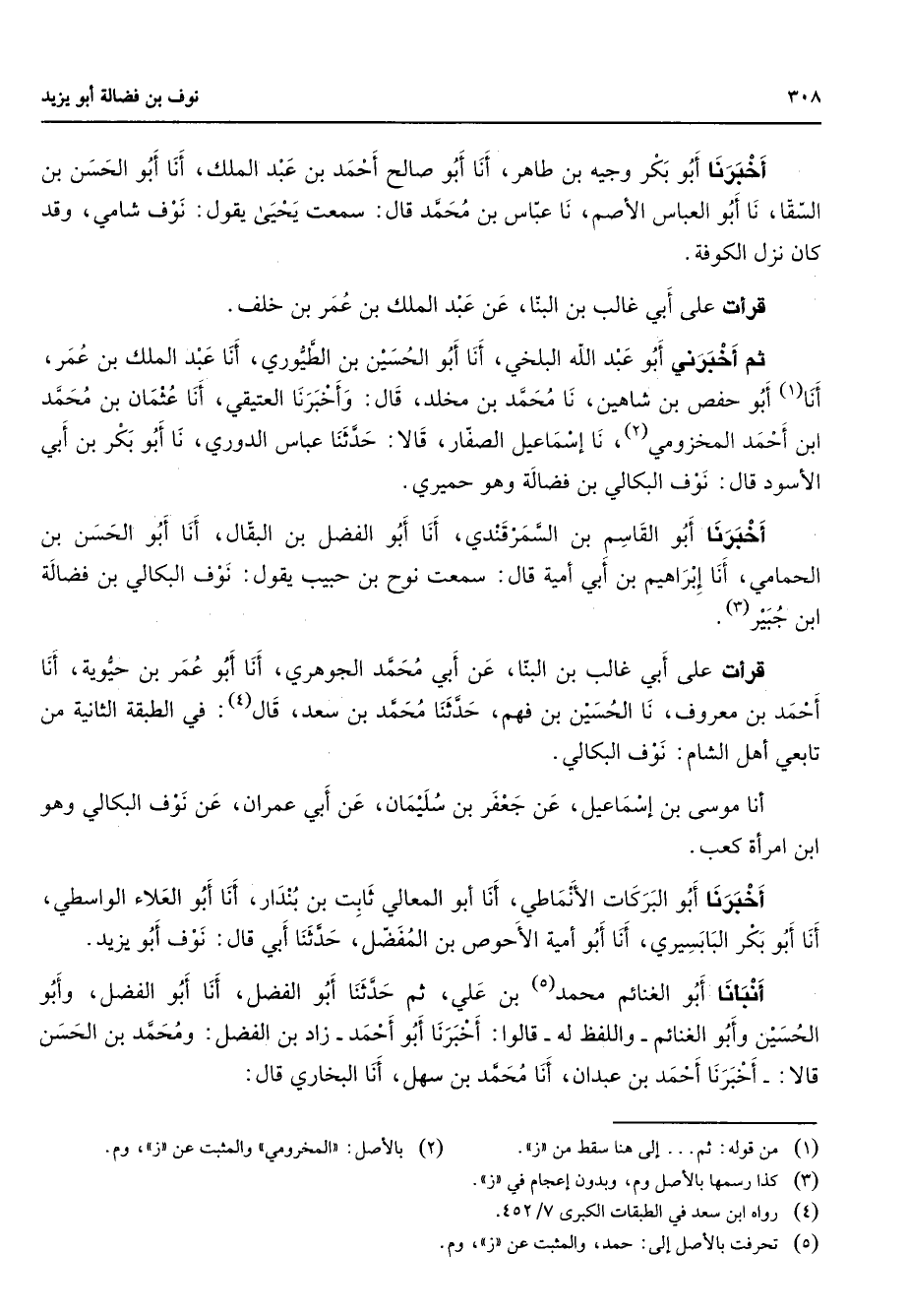 أخبرنا أبو بكر وجيه بن طاهر أنا أبو صالح أحمد بن عبد الملك أنا أبو الحسن بن السقا نا أبو العباس الأصم نا عباس بن محمد قال سمعت يحيى يقول نوف شامي وقد كان نزل الكوفة قرأت على أبي غالب بن البنا عن عبد الملك بن عمر بن خلف ثم أخبرني أبو عبد الله البلخي أنا أبو الحسين بن الطيوري أنا عبد الملك بن عمر أنا أبو حفص بن شاهين نا محمد بن مخلد قال وأخبرنا العتيقي أنا عثمان بن محمد ابن أحمد المخزومي (2) نا إسماعيل الصفار قالا حدثنا عباس الدوري نا أبو بكر بن أبي الأسود قال نوف البكالي بن فضالة وهو حميري أخبرنا أبو القاسم بن السمرقندي أنا أبو الفضل بن البقال أنا أبو الحسن بن الحمامي أنا إبراهيم بن أبي أمية قال سمعت نوح بن حبيب يقول نوف البكالي بن فضالة ابن جبير (3) قرأت على أبي غالب بن البنا عن أبي محمد الجوهري أنا أبو عمر بن حيوية أنا أحمد بن معروف نا الحسين بن فهم حدثنا محمد بن سعد قال (4) في الطبقة الثانية من تابعي أهل الشام نوف البكالي أنا موسى بن إسماعيل عن جعفر بن سليمان عن أبي عمران عن نوف البكالي وهو ابن امرأة كعب أخبرنا أبو البركات الأنماطي أنا أبو المعالي ثابت بن بندار أنا أبو العلاء الواسطي أنا أبو بكر البابسيري أنا أبو أمية الأحوص بن المفضل حدثنا أبي قال نوف أبو يزيد أنبأنا أبو الغنائم محمد (5) بن علي ثم حدثنا أبو الفضل أنا أبو الفضل وأبو الحسين وابو الغنائم واللفظ له قالوا أخبرنا أبو أحمد زاد بن الفضل ومحمد بن الحسن قالا أخبرنا أحمد بن عبدان أنا محمد بن سهل أنا البخاري قال