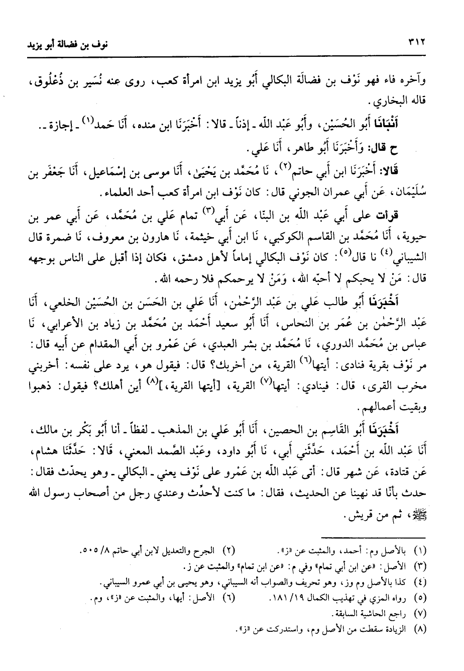 وآخره فاء فهو نوف بن فضالة البكالي أبو يزيد ابن امرأة كعب روى عنه نسير بن ذعلوق قاله البخاري أنبأنا أبو الحسين وأبو عبد الله إذنا قالا أخبرنا ابن منده أنا حمد (1) إجازة ح قال وأخبرنا أبو طاهر أنا علي قالا أخبرنا ابن أبي حاتم (2) نا محمد بن يحيى أنا موسى بن إسماعيل أنا جعفر بن سليمان عن أبي عمران الجوني قال كان نوف ابن امرأة كعب أحد العلماء قرأت على أبي عبد الله بن البنا عن أبي تمام علي بن محمد عن أبي عمر بن حيوية أنا محمد بن القاسم الكوكبي نا ابن أبي (3) خيثمة نا هارون بن معروف نا ضمرة قال الشيباني (4) نا قال (5) كان نوف البكالي إماما لأهل دمشق فكان إذا أقبل على الناس بوجهه قال من لا يحبكم لا أحبه الله ومن لا يرحمكم فلا رحمه الله أخبرنا أبو طالب علي بن عبد الرحمن أنا علي بن الحسن بن الحسين الخلعي أنا عبد الرحمن بن عمربن النحاس أنا أبو سعيد أحمد بن محمد بن زياد بن الأعرابي نا عباس بن محمد الدوري نا محمد بن بشر العبدي عن عمرو بن أبي المقدام عن أبيه قال مرنوف بقرية فنادى أيتها (6) القرية من أخربك قال فيقول هو يرد على نفسه أخربني مخرب القرى قال فينادي أيتها (7) القرية أيتها (8) القرية أين أهلك فيقول ذهبوا وبقيت أعمالهم أخبرنا أبو القاسم بن الحصين أنا أبو علي بن المذهب لفظا أنا أبو بكر بن مالك أنا عبد الله بن أحمد حدثني أبي نا أبو داود وعبد الصمد المعني قالا حدثنا هشام عن قتادة عن شهر قال أتى عبد الله بن عمرو على نوف يعني البكالي وهو يحدث فقال حدث بأنا قد نهينا عن الحديث فقال ما كنت لأحدث وعندي رجل من أصحاب رسول الله (صلى الله عليه وسلم) ثم من قريش