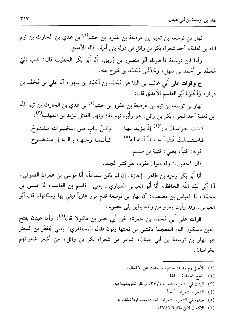 نهار بن توسعة بن تميم بن عرفجة بن عمرو بن حنتم (1) بن عدي بن الحارث بن تيم الله بن ثعلبة أحد شعراء بكر بن وائل في دولة بني أمية قاله الآمدي وأما ابن توسعة فأخبرناه أبو منصور بن زريق أنا أبو بكر الخطيب قال كتب إلي محمد بن أحمد بن سهل وحدثني محمد بن فتوح عنه ح وقرأت على أبي غالب بن البنا عن محمد بن أحمد بن سهل أنا علي بن محمد بن دينار وأخبرنا أبو القاسم الآمدي قال نهار بن توسعة بن تيم بن عرفجة بن عمرو بن حنتم (2) بن عدي بن الحارث بن تيم الله ابن ثعلبة أحد شعراء بكر بن وائل هو وأبوه توسعه ونهار القائل ليزيد بن المهلب (3) كانت خراسان دارا (4) إذ يزيد بها * وكل باب من الخيرات مفتوح فاستبدلت قتبا جعدا أنامله (5) * كأنما وجهه بالخل منضوح قوله قتبا يعني قتيبة بن مسلم قال الخطيب وله ديوان مفرد هو كثير الجيد أنا أبو بكر وجيه بن طاهر إجازة إن لم يكن سماعا أنا موسى بن عمران الصوفي أنا أبو عبد الله الحافظ أنا أبو العباس السياري يعني قاسم بن القاسم نا عيسى بن محمد نا العباس بن مصعب أن نهار بن توسعة قدم مرو غازيا فبقي بها وسكنها قال أبو العباس وقد رأيت بمرو من ولده باقين إلى عصرنا قرأت على أبي محمد بن حمزة عن أبي نصر بن ماكولا قال (6) وأما عينان بفتح العين وسكون الياء المعجمة باثنتين من تحتها ونون فقال المستغفري يعني جعفر بن المعتر هونهار بن توسعة بن أبي عينان شاعر من شعراء بكر بن وائل من أشعر شعرائهم بخراسان