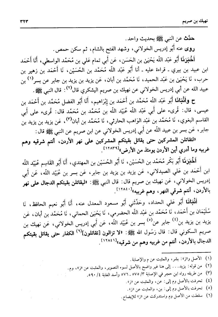 حدث عن النبي (صلى الله عليه وسلم) بحديث واحد روى عنه أبو إدريس الخولاني وشهد الفتح بالشام ثم سكن حمص أخبرنا أبو عبد الله يحيى بن الحسن عن أبي تمام علي بن محمد الواسطي أنا أحمد ابن عبيد بن بيري قراءة عليه أنا أبو عبد الله محمد بن الحسين نا أحمد بن زهير بن حرب نا يحيى بن عبد الحميد نا محمد بن أبان عن يزيد بن يزيد بن جابر عن بسر (1) بن عبيد الله عن أبي إدريس الخولاني عن هيك بن صريم اليشكري قال (2) قال النبي (صلى الله عليه وسلم) ح وأنبأنا أبو عبد الله محمد بن أحمد بن إبراهيم أنا أبو الفضل محمد بن احمد بن عيسى قال قرئ على أبي عبد الله عبيد الله بن محمد بن محمد قال قرئ على أبي القاسم البغوي نا محمد بن عبد الواهب الحارثي نا محمد بن أبان (3) عن يزيد بن يزيد بن جابر عن بسر بن عبيد الله عن أبي إدريس الخولاني عن ابن صريم عن النبي (صلى الله عليه وسلم) قال لتقاتلن المشركين حتى يقاتل بقيتكم المشركين على نهر الأردن أنتم شرقيه وهم غربيه وما أدري أين الأردن يومئذ من الأرض أخبرنا أبو بكر محمد بن الحسين نا أبو الحسين بن المهتدي أنا أبو القاسم عبيد الله ابن احمد بن علي الصيدلاني عن يزيد بن يزيد بن (4) جابر عن (5) بسر بن عبيد الله عن أبي إدريس الخولاني عن نهيك بن صريم قال قال النبي (صلى الله عليه وسلم) ليقاتلن بقيتكم الدجال على نهر بالأردن أنتم شرقي النهر وهم غربيه أنبأنا أبو علي الحداد وحدثني أبو مسعود المعدل عنه أنا أبو نعيم الحافظ نا سليمان بن أحمد نا محمد بن عبد الله الحضرمي نا يحيى الحماني نا محمد بن أبان عن يزيد بن يزيد بن جابر عن بسر بن عبيد الله عن أبي إدريس الخولاني عن نهيك بن صريم السكوني قال قال رسول الله (صلى الله عليه وسلم) لا تزالون تقاتلون (6) الكفار حتى يقاتل بقيتكم الدجال بالأردن أنت من غربيه وهم من شرقيه