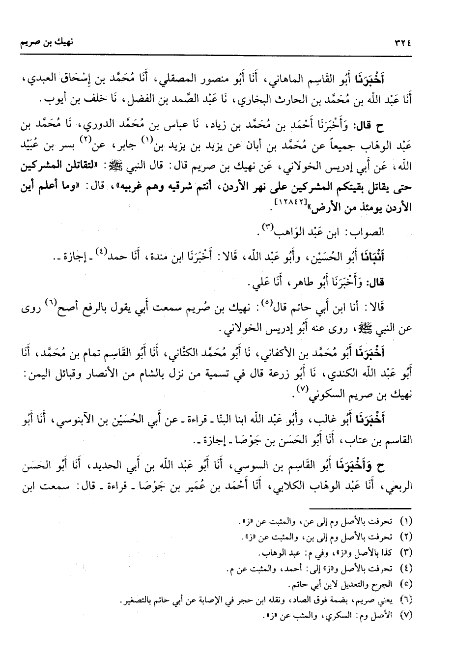أخبرنا أبو القاسم الماهاني أنا أبو منصور المصقلي أنا محمد بن إسحاق العبدي أنا عبد الله بن محمد بن الحارث البخاري نا عبد الصمد بن الفضل نا خلف بن أيوب ح قال وأخبرنا احمد بن محمد بن زياد نا عباس بن محمد الدوري نا محمد بن عبد الوهاب جميعا عن محمد بن أبان عن يزيد بن يزيد بن (1) جابر عن (2) بسر بن عبيد الله عن أبي إدريس الخولاني عن نهيك بن صريم قال قال النبي (صلى الله عليه وسلم) لتقاتلن المشركين حتى يقاتل بقيتكم المشركين على نهر الأردن أنتم شرقيه وهم غربيه قال وما أعلم أين الأردن يومئذ من الأرض الصواب ابن عبد الواهب (3) أنبأنا أبو الحسين وأبو عبد الله قالا أخبرنا ابن منده أنا حمد (4) إجازة قال وأخبرنا أبو طاهر أنا علي قالا أنا ابن أبي حاتم قال (5) نهيك بن صريم سمعت أبي يقول بالرفع أصح (6) روى عن النبي (صلى الله عليه وسلم) روى عنه أبو إدريس الخولاني أخبرنا أبو محمد بن الأكفاني نا أبو محمد الكتاني أنا أبو القاسم تمام بن محمد أنا أبو عبد الله الكندي نا أبو زرعة قال في تسمية من نزل بالشام من الأنصار وقبائل اليمن نهيك بن صريم السكوني (7) أخبرنا أبو غالب وابو عبد الله ابنا البنا قراءة عن أبي الحسين بن الآبنوسي أنا أبو القاسم بن عتاب أنا أبو الحسن بن جوصا إجازة ح واخبرنا أبو القاسم بن السوسي أنا أبو عبد الله بن أبي الحديد أنا أبو الحسن الربعي أنا عبد الوهاب الكلابي أنا أحمد بن عمير بن جوصا قراءة قال سمعت ابن