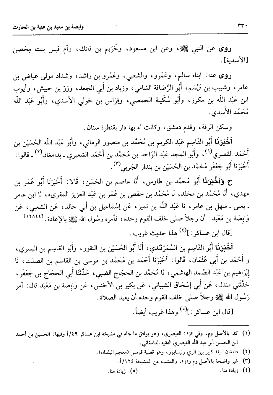 روى عن النبي (صلى الله عليه وسلم) وعن ابن مسعود وخريم بن فاتك وأم قيس بنت محصن الأسدية روى عنه ابناه سالم وعمرو الشعبي وعمرو بن راشد وشداد مولى عياض بن عامروشبيب بن ديسم أبو الرصافة الشامي وزياد بن أبي الجعد وزر بن حبيش وايوب ابن عبد الله ب مكرز وابو سكينة الحمصي وفراس بن خولي الأسدي وابو عبد الله محمد الأسدي وسكن الرقة وقدم دمشق وكانت له بها دار بقنطرة سنان أخبرنا أبو القاسم عبد الكريم بن محمد بن منصور الرماني وأبو عبد الله الحسين بن أحمد القصري (1) وابو المجد عبد الواحد بن محمد بن أحمد الشعيري بدامغان (2) قالوا أخبرنا أبو جعفر محمد بن الحسين بن بندار الجربي (3) ح وأخبرنا أبو محمد بن طاوس أنا عاصم بن الحسن قالا أخبرنا أبو عمر بن مهدي أنا محمد بن مخلد نا محمد بن حفص بن عمر بن عبد العزيز المقرئ نا ابن عامر يعني سهل بن عامر نا عبد الله بن نمير عن إسماعيل بن أبي خالد عن الشعبي عن وابصة بن معبد أن رجلا صلى خلف القوم وحده فأمره رسول الله (صلى الله عليه وسلم) بالإعادة قال ابن عساكر (4) هذا حديث غريب أخبرنا أبو القاسم بن السمرقندي أنا أبو الحسين بن النقور وأبو القاسم بن البسري وأحمد بن أبي عثمان قالوا أخبرنا أحمد بن محمد بن موسى بن القاسم بن الصلت نا إبراهيم بن عبد الصمد الهاشمي نا محمد بن الحجاج الضبي حدثنا أبي الحجاج بن جعفر حدثني مندل عن أبي إسحاق الشيباني عن بكير بن الأخنس عن وابصة بن معبد قال أمر رسول الله (صلى الله عليه وسلم) رجلا صلى خلف القوم وحده أن يعيد الصلاة قال ابن عساكر (5) وهذا غريب أيضا