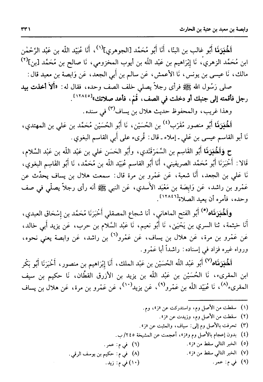 أخبرنا أبو غالب بن البنا أنا أبو محمد الجوهري (1) أنا عبيد الله بن عبد الرحمن ابن محمد الزهري نا إبراهيم بن عبد الله بن أيوب المخزومي نا صالح بن محمد بن (2) مالك نا عيسى بن يونس نا الأعمش عن سالم بن أبي الجعد عن وابصة بن معبد قال صلى رسول الله (صلى الله عليه وسلم) فرأى رجلا يصلي خلف الصف وحده فقال له ألا أخذت بيد رجل فأقمته إلى جنبك أو دخلت في الصف قم فأعد صلاتك وهذا غريب والمحفوظ حديث هلال بن يساف (3) في سنده أخبرنا أبو منصور مقرب (4) بن الحسين نا أبو الحسين محمد بن علي بن المهتدي نا أبو القاسم عيسى بن علي إملاء قال قرئ على أبي القاسم البغوي ح وأخبرنا أبو القاسم بن السمرقندي وأبو الحسن علي بن عبد الله بن عبد السلام قالا أخبرنا أبو محمد الصريفيني أنا أبو القاسم عبيد الله بن محمد نا أبو القاسم البغوي نا علي بن الجعد أنا شعبة عن عمرو بن مرة قال سمعت هلال بن يساف يحدث عن عمرو بن راشد عن وابصة بن معبد الأسدي عن النبي (صلى الله عليه وسلم) أنه رأى رجلا يصلي في صف وحده فأمره أن يعيد الصلاة وأخبرناه (5) أبو الفتح الماهاني أنا شجاع المصقلي أخبرنا محمد بن إسحاق العبدي أنا خيثمة ثنا السري بن يحيى نا أبو نعيم نا عبد السلام بن حرب عن يزيد أبي خالد عن عمرو بن مرة عن هلال بن يساف عن عمرو (6) بن راشد عن وابصة يعني نحوه ورواه غيره فزاد في إسناده راشدا أبا عمرو أخبرناه (7) أبو عبد الله الحسين بن عبد الملك أنا إبراهيم بن منصور أخبرنا أبو بكر ابن المقرئ نا الحسين بن عبد الله بن يزيد بن الأزرق القطان نا حكيم بن سيف المقرئ (8) نا عبيد الله بن عمرو (9) عن يزيد (10) عن عمرو بن مرة عن هلال بن يساف
