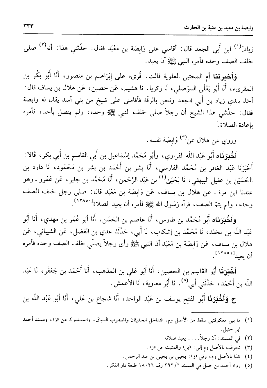 زياد (1) ابن أبي الجعد قال أقامني على وابصة بن معبد فقال حدثني هذا أنه (2) صلى خلف الصف وحده فأمره النبي (صلى الله عليه وسلم) أن يعيد وأخبرتنا أم المجتبى العلوية قالت قرئ على إبراهيم بن منصور أنا أبو بكر بن المقرئ أنا أبو يعلى الموصلي نا زكريا نا هشيم عن حصين عن هلال بن يساف قال أخذ بيدي زياد بن أبي الجعد ونحن بالرقة فأقامني على شيخ من بني أسد يقال له وابصة فقال حدثني هذا الشيخ أن رجلا صلى خلف النبي (صلى الله عليه وسلم) وحده ولم يتصل بأحد فأمره بإعادة الصلاة وروي عن هلال عن (3) وابصة نفسه أخبرناه أبو عبد الله الفراوي وأبو محمد إسماعيل بن أبي القاسم بن أبي بكر قالا أخبرنا عبد الغافر بن محمد الفارسي أنا بشر بن أحمد بن بشر بن محمود نا داود بن الحسين بن عقيل البيهقي نا يحيى (4) بن عبد الرحمن أنا محمد بن جابر عن عمرو وهو عندناابن مرة عن هلال بن يساف عن وابصة بن معبد قال صلى رجل خلف الصف وحده ولم يتم الصف فرآه رسول الله (صلى الله عليه وسلم) فأمره أن يعيد الصلاة وأخبرناه أبو محمد بن طاوس أنا عاصم بن الحسن أنا أبو عمر بن مهدي أنا أبو عبد الله بن مخلد نا محمد بن إشكاب نا أبي حدثنا عدي بن الفضل عن الشيباني عن هلال بن يساف عن وابصة بن معبد أن النبي (صلى الله عليه وسلم) رأى رجلا يصلي خلف الصف وحده فأمره أن يعيد أخبرنا أبو القاسم بن الحصين أنا أبو علي بن المذهب أنااحمد بن جعفر نا عبد الله بن احمد حدثني أبي (5) نا أبو معاوية نا الأعمش ح وأخبرنا أبو الفتح يوسف بن عبد الواحد أنا شجاع بن علي أنا أبو عبد الله بن
