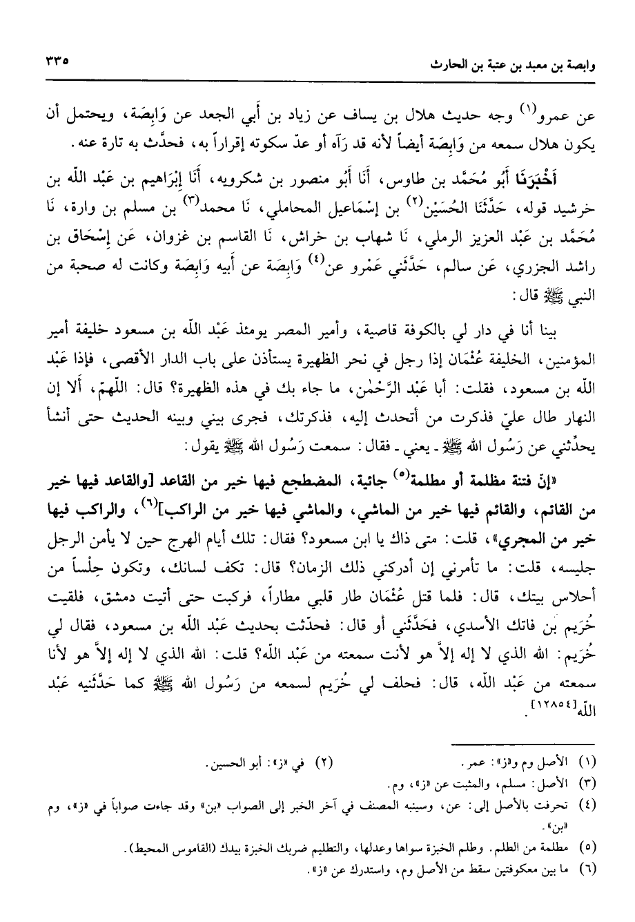 عن عمرو (1) وجه حديث هلال بن يساف عن زياد بن أبي الجعد عن وابصة ويحتمل أن يكون هلال سمعه من وابصة أيضا لأنه قد رآه أو عد سكوته إقرارا به فحدث به تارة عنه أخبرنا أبو محمد بن طاوس أنا أبو منصور بن شكرويه أنا إبراهيم بن عبد الله خرشيد قوله حدثنا الحسين (2) بن إسماعيل المحاملي نا محمد (3) بن مسلم بن وارة نا محمد بن عبد العزيز الرملي نا شهاب بن خراش نا القاسم بن غزوان عن إسحاق بن راشد الجزري عن سالم حدثني عمرو عن (4) وابصة عن أبيه وابصة وكانت له صحبة من النبي (صلى الله عليه وسلم) قال بينا أنا في دار لي بالكوفة قاصية وأمير المصر يومئذ عبد الله بن مسعود خليفة أمير المؤمنين الخليفة عثمان إذا رجل في نحر الظهيرة يستأذن على باب الدار الأقصى فإذا عبد الله بن مسعود فقلت أبا عبد الرحمن ما جاء بك في هذه الظهيرة قال اللهم ألا إن النهار طال علي فذكرت من أتحدث إليه فذكرتك فجرى بيني وبينه الحديث حتى أنشأ يحدثني عن رسول الله (صلى الله عليه وسلم) يعني فقال سمعت رسول الله (صلى الله عليه وسلم) يقول إن فتنة مظلمة أو مطلمة (5) جائية المضطجع فيها خير من القاعد والقاعد فيها خير من القائم والقائم فيها خير من الماشي والماشي فيها خير من الراكب (6) والراكب فيها خير من المجري قلت متى ذاك يا ابن مسعود فقال تلك أيام الهرج حين لا يأمن الرجل جليسه قلت ما تأمرني إن أدركني ذلك الزمان قال تكف لسانك وتكون حلسا من أحلاس بيتك قال فلما قتل عثمان طار قلبي مطارا فركبت حتى أتيت دمشق فلقيت خريم بن فاتك الأسدي فحدثني أو قال فحدثت بحديث عبد الله بن مسعود فقال لي خريم الله الذي لا إله إلا هو لأنت سمعته من عبد الله قلت الله الذي لا إله إلا هولأنا سمعته من عبد الله قال فحلف لي خريم لسمعه من رسول الله (صلى الله عليه وسلم) كما حدثنيه عبد الله