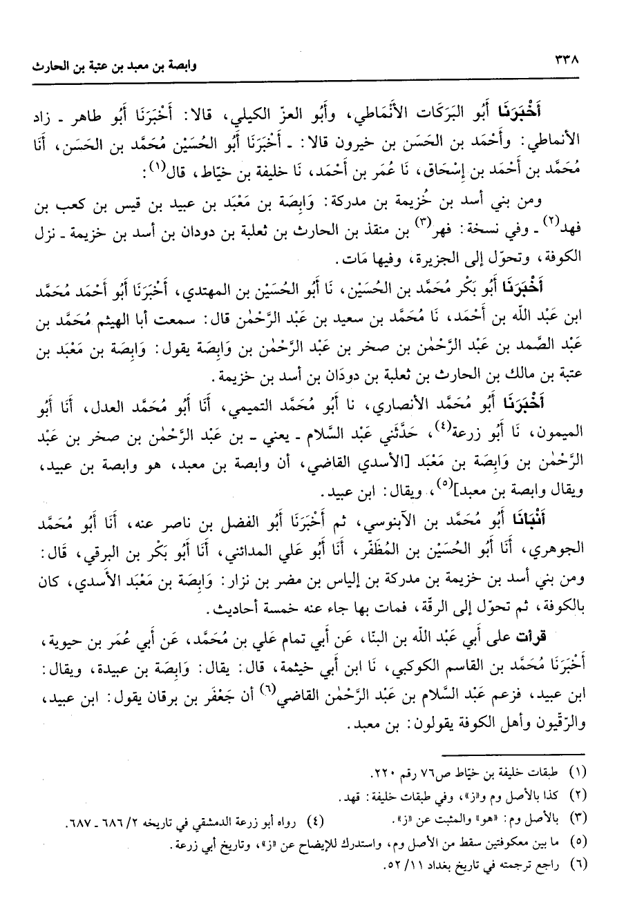أخبرنا أبو البركات الأنماطي وأبو العز الكيلي قالا أخبرنا أبو طاهر زاد الأنماطي وأحمد بن الحسن بن خيرون قالا أخبرنا أبو الحسين محمد بن الحسن أنا محمد بن أحمد بن إسحاق نا عمر بن أحمد نا خليفة بن خياط قال (1) ومن بني أسد بن خزيمة بن مدركة وابصة بن معبد بن عبيد بن قيس بن كعب بن فهد (2) وفي نسخة فهر (3) بن منقذ بن الحارث بن ثعلبة بن دودان بن أسد بن خزيمة نزل الكوفة وتحول إلى الجزيرة وفيها مات أخبرنا أبو بكر محمد بن الحسين نا أبو الحسين بن المهتدي أخبرنا أبو أحمد محمد ابن عبد الله بن أحمد نا محمد بن سعيد بن عبد الرحمن قال سمعت أبا الهيثم محمد بن عبد الصمد بن عبد الرحمن بن صخر بن عبد الرحمن بن وابصة يقول وابصة بن معبد بن عتبة بن مالك بن الحارث بن ثعلبة بن دودان بن أسد بن خزيمة أخبرنا أبو محمد الأنصاري نا أبو محمد التميمي أنا أبو محمد العدل أنا أبو الميمون نا أبو زرعة (4) حدثني عبد السلام يعني بن عبد الرحمن بن صخر بن عبد الرحمن بن وابصة بن معبد الأسدي القاضي أن وابصة بن معبد هو وابصة بن عبيد ويقال وابصة بن معبد (5) ويقال ابن عبيد أنبأنا أبو محمد بن الآبنوسي ثم أخبرنا أبو الفضل بن ناصر عنه أنا أبو محمد الجوهري أنا أبو الحسين بن المظفر أنا أبو علي المدائني أنا أبو بكر بن البرقي قال ومن بني أسد بن خزيمة بن مدركة بن إلياس بن مضر بن نزار وابصة بن معبد الأسدي كان بالكوفة ثم تحول إلى الرقة فمات بها جاء عنه خمسة أحاديث قرأت على أبي عبد الله بن البنا عن أبي تمام علي بن محمد عن أبي عمر بن حيوية أخبرنا محمد بن القاسم الكوكبي نا ابن أبي خيثمة قال يقال وابصة بن عبيدة ويقال ابن عبيد فزعم عبد السلام بن عبد الرحمن القاضي (6) أن جعفر بن برقان يقول ابن عبيد والرقيون وأهل الكوفة يقولون بن معبد
