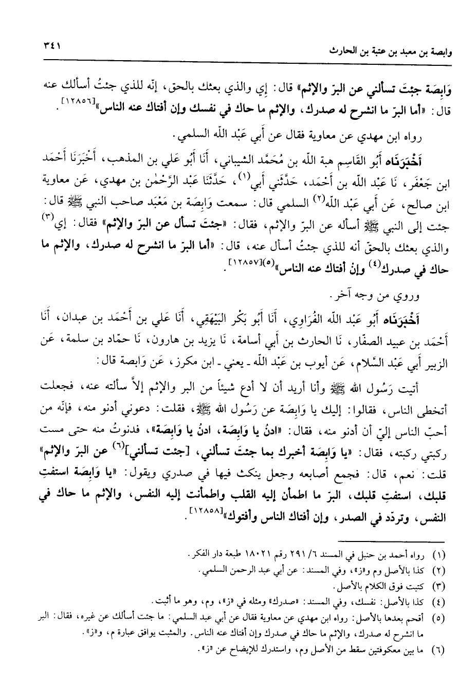 (5) اقحم بعدها بالاصل: رواه ابن مهدي عن معاوية فقال عن أبي عبد السلمي: ما جئت أسألك عن غيره فقال: البر ما انشرح له صدرك والاثم ما حاك في صدرك وإن أفتاك عنه الناس