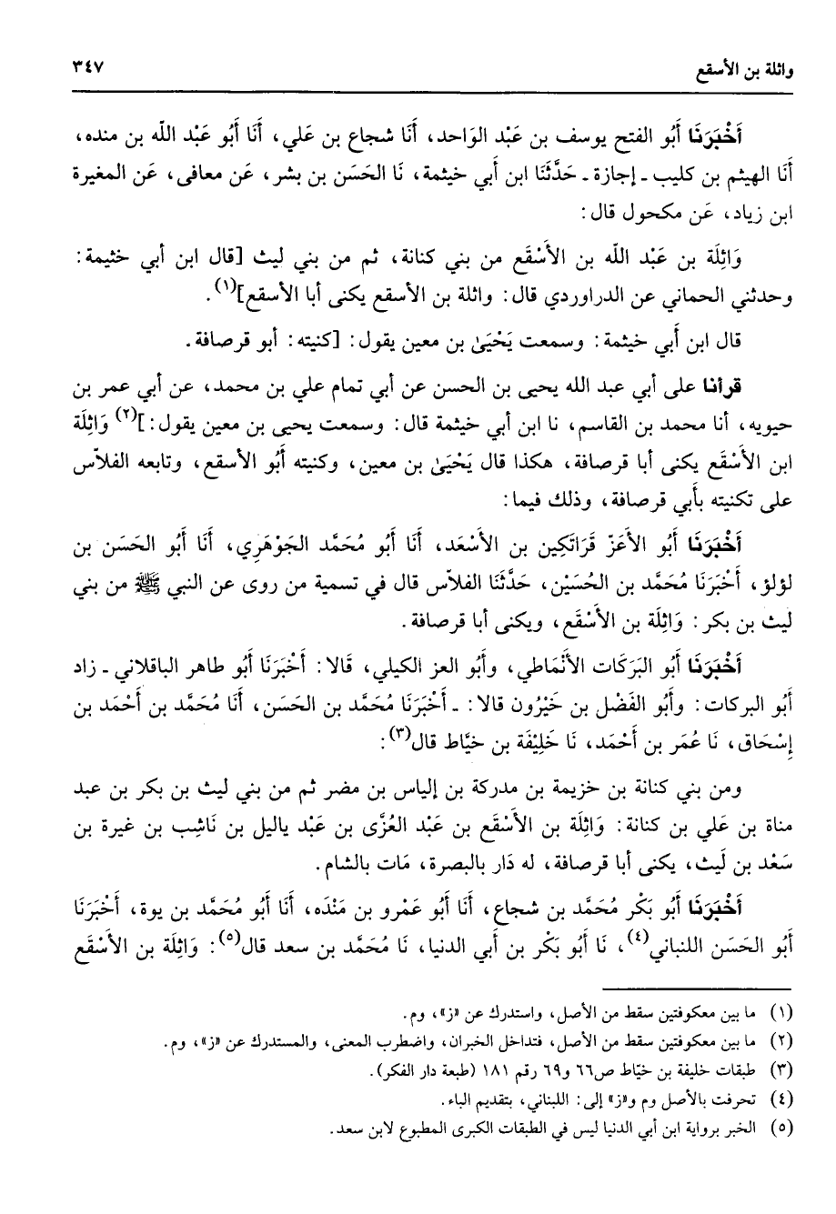 أخبرنا أبو الفتح يوسف بن عبد الواحد أنا شجاع بن علي أنا أبو عبد الله بن منده أنا الهيثم بن كليب إجازة حدثنا ابن أبي خيثمة نا الحسن بن بشر عن معافى عن المغيرة ابن زياد عن مكحول قال واثلة بن عبد الله بن الأسقع من بني كنانة ثم من بني ليث قال ابن أبي خيثمة وحدثني الحماني عن الدراوردي قال واثلة بن الأسقع (1) يكنى أبا الأسقع قال ابن أبي خيثمة وسمعت يحيى بن معين يقول كنيته أبو قرصافة قرأنا على أبي عبد الله يحيى بن الحسن عن أبي تمام علي بن محمد عن أبي عمر بن حيوية أنا محمد بن القاسم نا ابن أبي خيثمة قال وسمعت يحيى بن معين يقول (2) واثلة ابن الأسقع يكنى أبا قرصافة هكذا قال يحيى بن معين وكنيته أبو الأسقع وتابعه الفلاس على تكنيته بأبي قرصافة وذلك فيما أخبرنا أبو الأعز قراتكين بن الأسعد أنا أبو محمد الجوهري أنا أبو الحسن بن لؤلؤ أخبرنا محمد بن الحسين حدثنا الفلاس قال في تسمية من روى عن النبي (صلى الله عليه وسلم) من بني ليث بن بكر واثلة بن الأسقع ويكنى أبا قرصافة أخبرنا أبو البركات الأنماطي وأبو العز الكيلي قالا أخبرنا أبو طاهر الباقلاني زاد أبو البركات وأبو الفضل بن خيرون قالا أخبرنا محمد بن الحسن أنا محمد بن أحمد بن إسحاق نا عمر بن أحمد نا خليفة بن خياط قال (3) ومن بني كنانة بن خزيمة بن مدركة بن إلياس بن مضر ثم من بني ليث بن بكر بن عبد مناة بن علي بن كنانة واثلة بن الأسقع بن عبد العزى بن عبد ياليل بن ناشب بن غيرة بن سعد بن ليث يكنى أبا قرصافة له دار بالبصرة مات بالشام أخبرنا أبو بكر محمد بن شجاع أنا أبو عمرو بن منده أنا أبو محمد بن يوة أخبرنا أبو الحسن اللنباني (4) نا أبو بكر بن أبي الدنيا نا محمد بن سعد قال (5) واثلة بن الأسقع