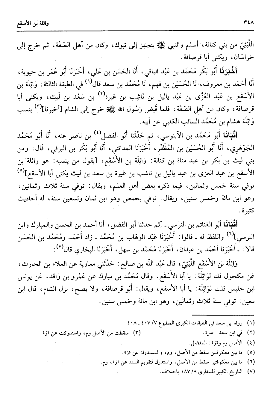 الليثي من بني كنانة أسلم والنبي (صلى الله عليه وسلم) يتجهز إلى تبوك وكان من أهل الصفة ثم خرج إلى خراسان ويكنى أبا قرصافة أخبرنا أبو بكر محمد بن عبد الباقي أنا الحسن بن علي أخبرنا أبو عمر بن حيوية أنا أحمد بن معروف نا الحسين بن فهم نا محمد بن سعد قال (1) في الطبقة الثالثة واثلة بن الأسقع بن عبد العزى بن عبد ياليل بن ناشب بن غيرة (2) بن سعد بن ليث ويكنى أبا قرصافة وكان من أهل الصفة فلما قبض رسول الله (صلى الله عليه وسلم) خرج إلى الشام أخبرنا (3) بنسب واثلة هشام بن محمد السائب الكلبي عن أبيه أنبأنا أبو محمد بن الآبنوسي ثم حدثنا أبو (4) الفضل بن ناصر عنه أنا أبو محمد الجوهري أنا أبو الحسين بن المظفر أخبرنا المدائني أنا أبو بكر بن البرقي قال ومن بني ليث بن بكر بن عبد مناة بن كنانة واثلة بن الأسقع يقول من ينسبه هو واثلة بن الأسقع بن عبد العزى بن عبد ياليل بن ناشب بن غيرة بن سعد بن ليث يكنى أبا الأسقع (5) توفي سنة خمس وثمانين فيما ذكره بعض أهل العلم ويقال توفي سنة ثلاث وثمانين وهو ابن مائة وخمس سنين ويقال توفي بحمص وهو ابن ثمان وتسعين سنة له أحاديث كثيرة أنبأنا أبو الغنائم بن النرسي ثم حدثنا أبو الفضل أنااحمد بن الحسن والمبارك وابن النرسي (6) واللفظ له قالوا أبخرنا عبد الوهاب بن محمد زاد احمد ومحمد بن الحسن قالا أخبرنا أحمد بن عبدان أخبرنا محمد بن سهل أخبرنا البخاري قال (7) واثلة بن الأسقع الليثي قال عبد الله بن صالح حدثني معاوية عن العلاء بن الحارث عن مكحول قلنا لواثلة يا أبا الأسقع وقال محمد بن مبارك عن عمرو بن واقد عن يونس ابن حلبس قلت لواثلة يا أبا الأسقع ويقال أبو قرصافة ولا يصح نزل الشام قال ابن معين توفي سنة ثلاث وثمانين وهو ابن مائة وخمس سنين