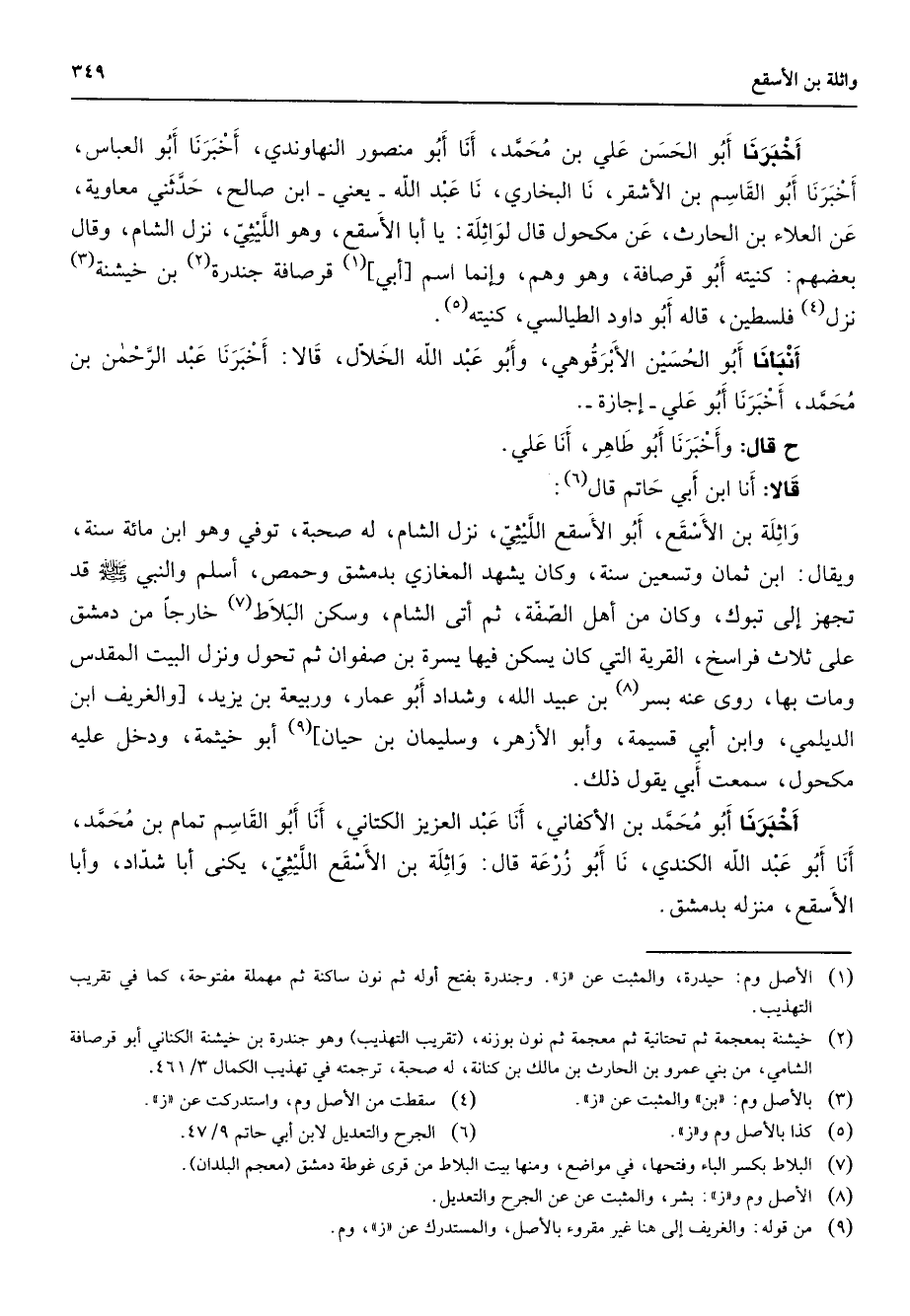 أخبرنا أبو السن علي بن محمد أنا أبو منصور النهاوندي أخبرنا أبو العباس أخبرنا أبو القاسم بن الأشقر نا البخاري نا عبد الله يعني ابن صالح حدثني معاوية عن العلاء بن الحارث عن مكحول قال لواثلة يا ابا الأسقع وهو الليثي نزل الشام وقال بعضهم كنيته أبو قرصافة وهو وهم وإنما اسم أبي (1) قرصافة جندرة (2) بن خيشنة (3) نزل (4) فلسطين قاله أبو داود الطيالسي كنيته (5) أنبأنا أبو الحسين الأبرقوهي وابي عبد الله الخلال قالا أخبرنا عبد الرحمن بن محمد أخبرنا أبو علي إجازة ح قال وأخبرنا أبو طاهر أنا علي قالا أنا ابن أبي حاتم قال (6) واثلة بن الأسقع أبو الأسقع الليثي نزل الشام له صحبة توفي وهو ابن مائة سنة ويقال ابن ثمان وتسعين سنة وكان يشهد المغازي بدمشق وحمص أسلم والنبي (صلى الله عليه وسلم) قد تجهز إلى تبوك وكان من أهل الصفة ثم أتى الشام وسكن البلاط (7) خارجا من دمشق على ثلاث فراسخ القرية التي كان يسكن فيها يسرة بن صفوان ثم تحول ونزل البيت المقدس ومات بها روى عنه بسر (8) بن عبيد الله وشداد أبو عمار وربيعة بن يزيد والغريف ابن الديلمي وابن أبي قسيمة وأبو الأزهر وسليمان بن حيان (9) أبو خيثمة ودخل عليه مكحول سمعت أبي يقول ذلك أخبرنا أبو محمد بن الأكفاني أنا عبد العزيز الكتاني أنا أبو القاسم تمام بن محمد أنا أبو عبد الله الكندي نا أبو زرعة قال واثلة بن الأسقع الليثي يكنى أبا شداد وابا الأسقع منزله بدمشق