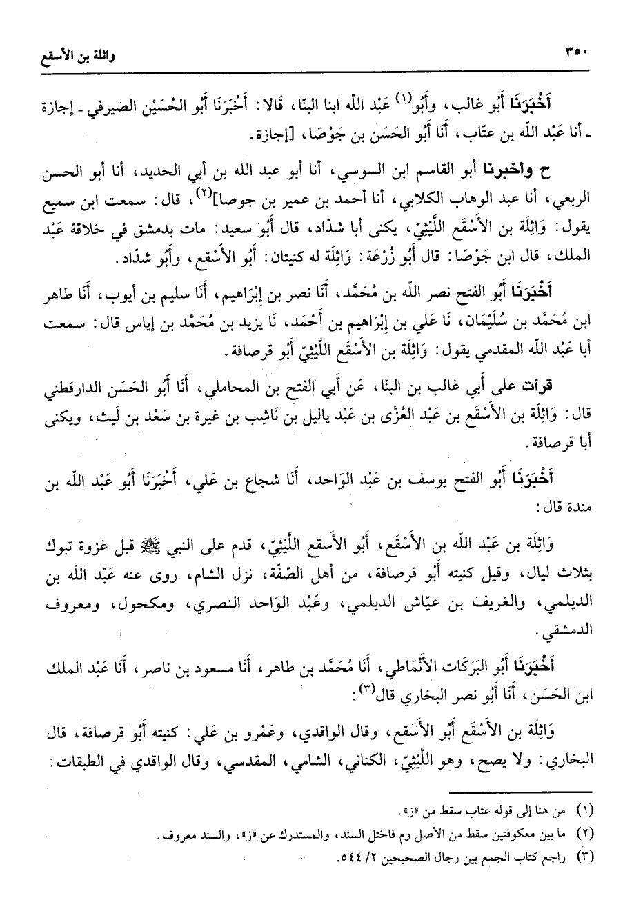 أخبرنا أبو غالب وأبو (1) عبد الله ابنا البنا قالا أخبرنا أبو الحسين الصيرفي إجازة أنا عبد الله بن عتاب أنا أبو الحسن بن جوصا إجازة ح وأخبرنا أبو القاسم ابن السوسي أنا أبو عبد الله بن أبي الحديد أنا أبو الحسن الربعي أنا عبد الوهاب الكلابي أنا أحمد بن عمير بن جوصا (2) قال سمعت ابن سميع يقول واثلة بن الأسقع الليثي يكنى أبا شداد قال أبو سعيد مات بدمشق في خلافة عبد الملك قال ابن جوصا قال أبو زرعة واثلة له كنيتان أبو الأسقع وأبو شداد أخبرنا أبو الفتح نصر الله بن محمد أنا نصر بن إبراهيم أنا سليم بن أيوب أنا طاهر ابن محمد بن سليمان نا علي بن إبراهيم بن أحمد نا يزيد بن محمد بن إياس قال سمعت أبا عبد الله المقدمي يقول واثلة بن الأسقع الليثي أبو قرصافة قرأت على أبي غالب بن البنا عن أبي الفتح بن المحاملي أنا أبو الحسن الدارقطني قال واثلة بن الأسقع بن عبد العزى بن عبد ياليل بن ناشب بن غيرة بن سعد بن ليث ويكنى أبا قرصافة أخبرنا أبو الفتح يوسف بن عبد الواحد أنا شجاع بن علي أخبرنا أبو عبد الله بن مندة قال واثلة بن عبد الله بن الأسقع أبو الأسقع الليثي قدم على النبي (صلى الله عليه وسلم) قبل غزوة تبوك بثلاث ليال وقيل كنيته أبو قرصافة من أهل الصفة نزل الشام روى عنه عبد الله بن الديلمي والغريف بن عياش الديلمي وعبد الواحد النصري ومكحول ومعروف الدمشقي أخبرنا أبو البركات الأنماطي أنا محمد بن طاهر أنا مسعود بن ناصر أنا عبد الملك ابن الحسن أنا أبو نصر البخاري قال (3) واثلة بن الأسقع أبو الأسقع وقال الواقدي وعمرو بن علي كنيته أبو قرصافة قال البخاري ولا يصح وهو الليثي الكناني الشامي المقدسي وقال الواقدي في الطبقات