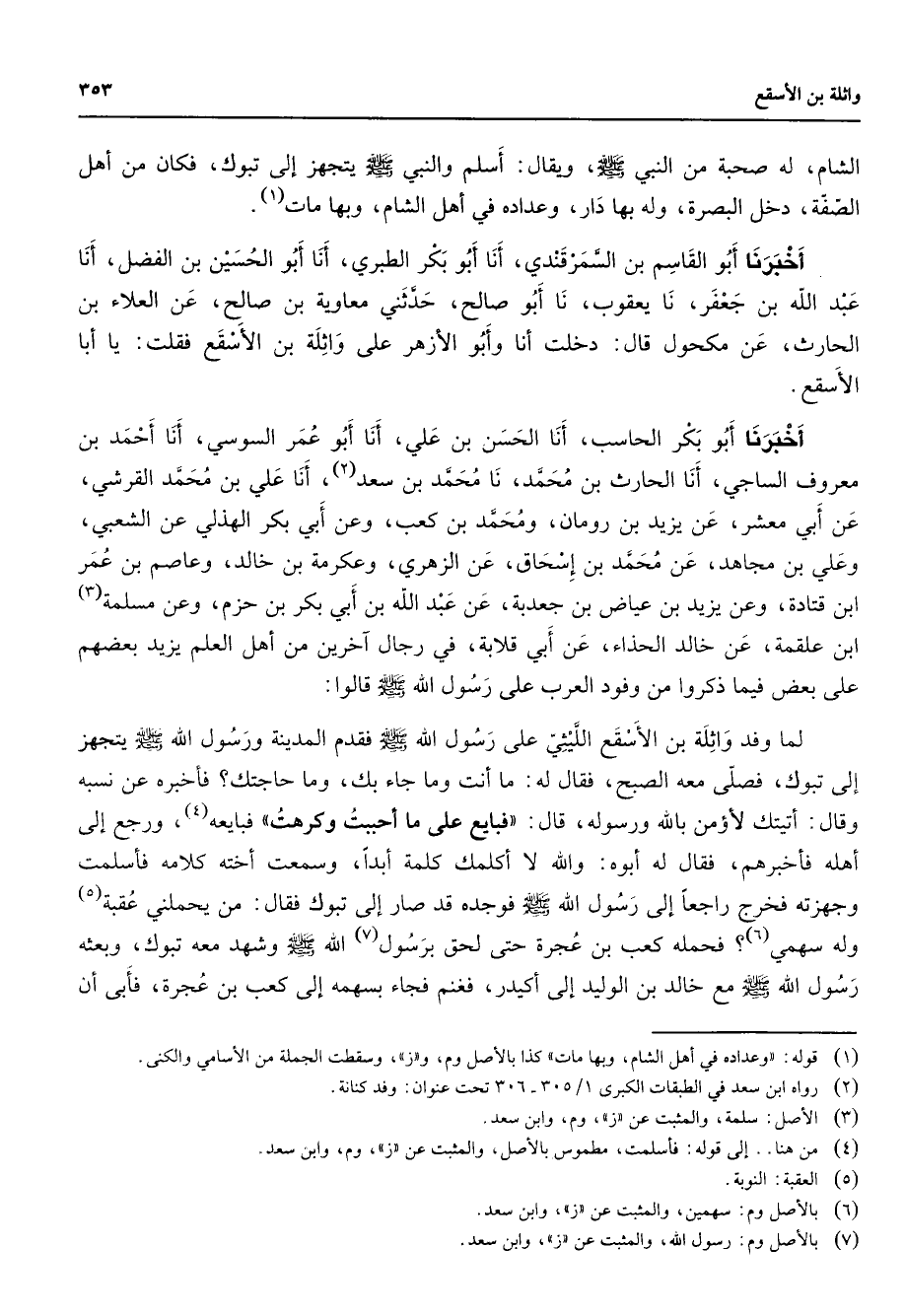 الشام له صحبة من النبي (صلى الله عليه وسلم) ويقالاسلم والنبي (صلى الله عليه وسلم) يتجهز إلى تبوك فكان من أهل الصفة دخل البصرة وله بها دار وعداده في أهل الشام وبها مات (1) أخبرنا أبو القاسم بن السمرقندي أنا أبو بكر الطبري أنا أبو الحسين بن الفضل أنا عبد الله بن جعفر نا يعقوب نا أبو صالح حدثني معاوية بن صالح عن العلاء بن الحارث عن مكحول قال دخلت أنا وأبو الأزهر على واثلة بن الأسقع فقلت يا ابا الأسقع أخبرنا أبو بكر الحاسب أنا الحسن بن علي أنا أبو عمر السوسي أنا أحمد بن معروف الساجي أنا الحارث بن محمد نا محمد بن سعد (2) أنا علي بن محمد القرشي عن أبي معشر عن يزيد بن رومان ومحمد بن كعب وعن أبي بكر الهذلي عن الشعبي وعلي بن مجاهد عن محمد بن إسحاق عن الزهري وعكرمة بن خالد وعاصم بن عمر ابن قتادة وعن يزيد بن عياض بن جعدبة عن عبد الله بن أبي بكر بن حزم وعن مسلمة (3) ابن علقمة عن خالد الحذاء عن أبي قلابة في رجال آخرين من أهل العلم يزيد بعضهم على بعض فيما ذكروا من وفود العرب على رسول الله (صلى الله عليه وسلم) قالوا لما وفد واثلة بن الأسقع الليثي على رسول الله (صلى الله عليه وسلم) فقدم المدينة ورسول الله (صلى الله عليه وسلم) يتجهز إلى تبوك فصلى معه الصبح فقال له ما أنت وما جاء بك وما حاجتك فأخبره عن نسبه وقال أتيتك لأؤمن بالله ورسوله قال فبايع على ما أحببت وكرهت فبايعه (4) ورجع إلى أهله فأخبرهم فقال له أبوه والله لا أكلمك كلمة أبدا وسمعت أخته كلامه فأسلمت وجهزته فخرج راجعا إلى رسول الله (صلى الله عليه وسلم) فوجده قد صار إلى تبوك فقال من يحملني عقبة (5) وله سهمي (6) فحمله كعب بن عجرة حتى لحق (7) برسول الله (صلى الله عليه وسلم) وشهد معه تبوك وبعثه رسول الله مع خالد بن الوليد إلى أكيدر فغنم فجاء بسهمه إلى كعب بن عجرة فأبى أن يقبله وسوغه إياه وقال إنما حملتك لله انتهى