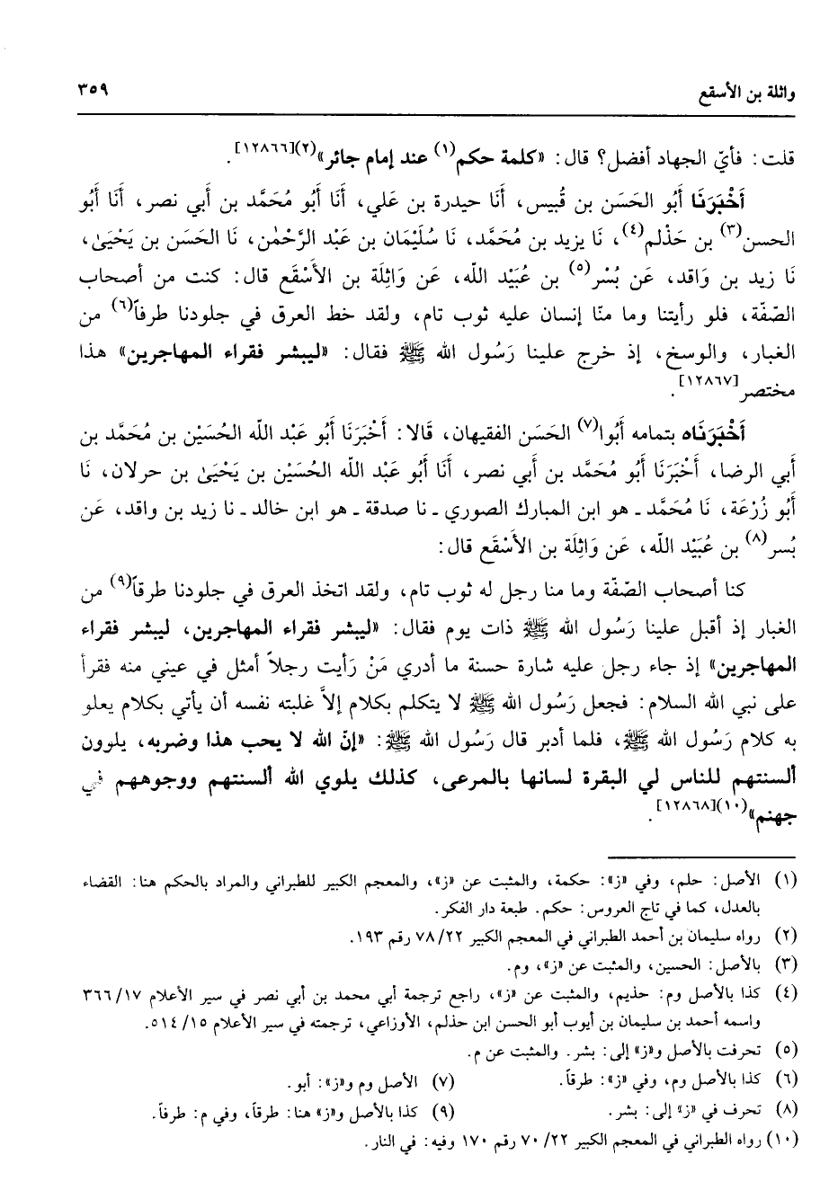قلت فأي الجهاد أفضل قال كلمة حكم (1) عند إمام جائر (2) أخبرنا أبو الحسن بن قبيس أنا حيدرة بن علي أنا أبو محمد بن أبي نصر أنا أبو الحسن (3) بن حذلم (4) نا يزيد بن محمد نا سليمان بن عبد الرحمن نا الحسن بن يحيى نا زيد بن واقد عن بسر (5) بن عبيد الله عن واثلة بن الأسقع قال كنت من أصحاب الصفة فلو رايتنا وما من إنسان عليه ثوب تام ولقد خط العرق في جلودنا طرفا (6) من الغبار والوسخ إذ خرج علينا رسول الله (صلى الله عليه وسلم) فقال ليبشر فقراء المهاجرين هذا مختصر أخبرناه بتمامه أبو (7) الحسن الفقيهان قالا أخبرنا أبو عبد الله الحسين بن محمد بن أبي الرضا أخبرنا أبو محمد بن أبي نصر أنا أبو عبد الله الحسين بن يحيى بن حرلان نا أبو زرعة نا محمد هو ابن المبارك الصوري نا صدقة هو ابن خالد نا زيد بن واقد عن بسر (8) بن عبيد الله عن واثلة بن الأسقع قال كنا أصحاب الصفة وما منا رجل له ثوب تام ولقد اتخذ العرق في جلودنا طرقا (9) من الغبار إذ أقبل علينا رسول الله (صلى الله عليه وسلم) ذات يوم فقال ليبشر فقراء المهاجرين ليبشر فقراء المهاجرين إذ جاء رجل عليه شارة حسنة ما أدري من رأيت رجلا أمثل في عيني منه فقرأ على نبي الله السلام فجعل رسول الله (صلى الله عليه وسلم) لا يتكلم بكلام إلا غلبته نفسه أن يأتي بكلام يعلو به كلام رسول الله (صلى الله عليه وسلم) فلما أدبر قال رسول الله (صلى الله عليه وسلم) إن الله لا يحب هذا وضربه يلوون ألسنتهم للناس لي البقرة لسانها بالمرعى كذلك يلوي الله ألسنتهم ووجوههم في جهنم (10)
