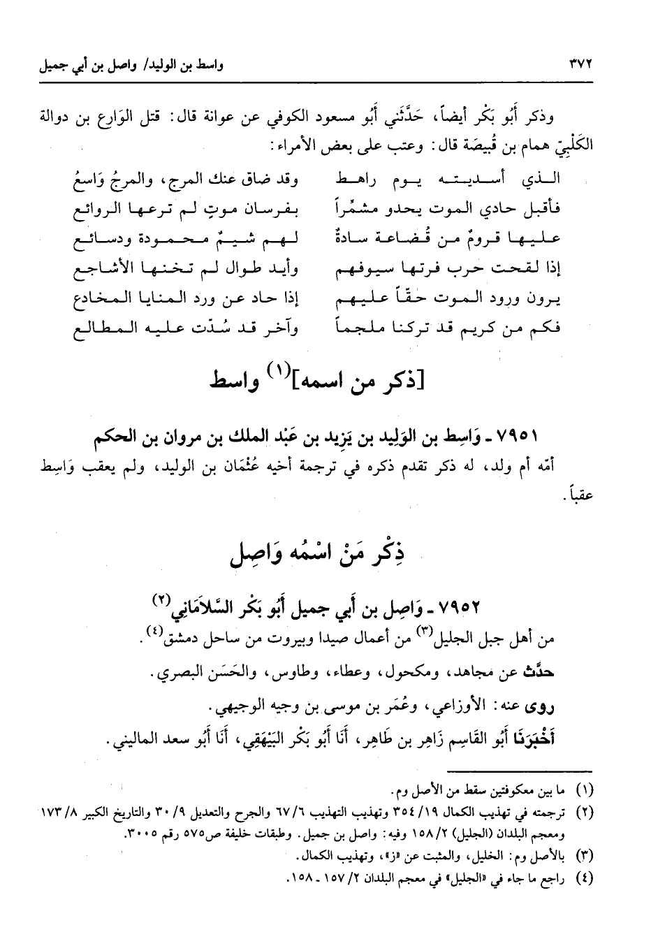 (2) ترجمته في تهذيب الكمال 19 / 354 وتهذيب التهذيب 6 / 67 والجرح والتعديل 9 / 30 والتاريخ الكبير 8 / 173 ومعجم البلدان (الجليل) 2 / 158 وفيه: واصل بن جميل
