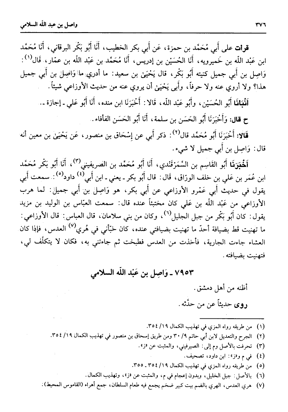 7953 - واصل بن عبد الله السلامي أظنه من أهل دمشق روى حديثا عن من حدثه
