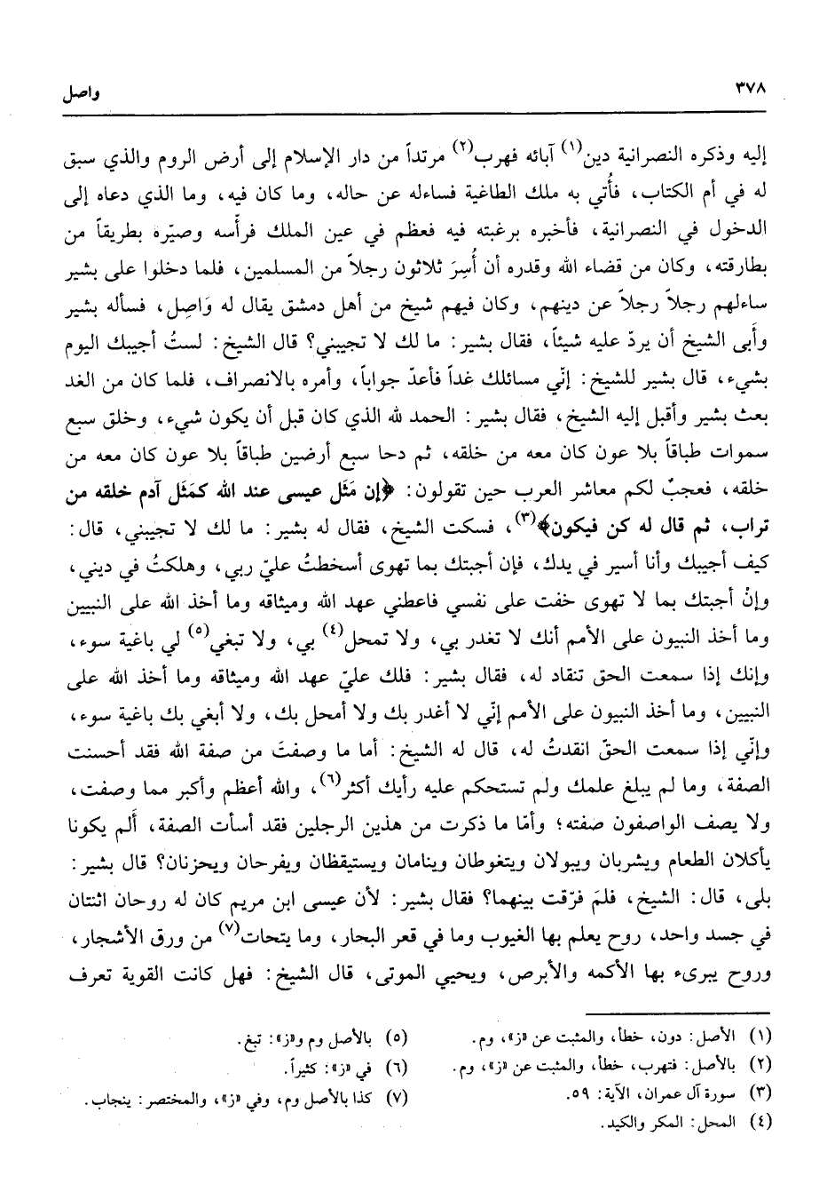 إليه وذكره النصرانية دين (1) آبائه فهرب (2) مرتدا من دار الإسلام إلى أرض الروم والذي سبق له في أم الكتاب فأتي به ملك الطاغية فساءله عن حاله وما كان فيه وما الذي دعاه إلى الدخول في النصرانية فأخبره برغبته فيه فعظم في عين الملك فرأسه وصيره بطريقا من بطارقته وكان من قضاء الله وقدره أن اسر ثلاثون رجلا من المسلمين فلما دخلوا على بشير ساءلهم رجلا رجلا عن دينهم وكان فيهم شيخ من أهل دمشق يقال له واصل فسأله بشير وأبى الشيخ أن يرد عليه شيئا فقال بشير ما لك لا تجيبني قال الشيخ لست أجيبك اليوم بشئ قال بشير للشيخ إني مسائلك غدا فأعد جوابا وأمره بالانصراف فلما كان من الغد بعث بشير وأقبل إليه الشيخ فقال بشير الحمد لله الذي كان قبل أن يكون شئ وخلق سبع سموات طباقا بلا عون كان معه من خلقه ثم دحا سبع أرضين طباقا بلا عون كان معه من خلقه فعجب لكم معاشر العرب حين تقولون " إن مثل عيسى عند الله كمثل آدم خلقه من تراب ثم قال له كن فيكون " (3) فسكت الشيخ فقال له بشير ما لك لا تجيبني قال كيف أجيبك وأنا أسير في يدك فإن أجبتك بما تهوى أسخطت علي ربي وهلكت في ديني وإن أجبتك بما لا تهوى خفت على نفسي فاعطني عهد الله وميثاقه وما أخذ الله على النبيين وما أخذ النبيون على الأمم أنك لا تغدر بي ولا تمحل (4) بي ولا تبغي (5) لي باغية سوء وإنك إذا سمعت الحق تنقاد له فقال بشير فلك علي عهد الله وميثاقه وما أخذ الله على النبيين وما أخذ النبيون على الأمم إني لا أغدر بك ولا أمحل بك ولا أبغي بك باغية سوء وإني إذا سمعت الحق انقدت له قال له الشيخ أماما وصفت من صفة الله فقد أحسنت الصفة وما لم يبلغ علمك ولم تستحكم عليه رأيك (6) أكثر والله أعظم وأكبر مما وصفت ولا يصف الواصفون صفته وأما ما ذكرت من هذين الرجلين فقد أسأت الصفة ألم يكونا يأكلان الطعام ويشربان ويبولان ويتغوطان وينامان ويستيقظان ويفرحان ويحزنان قال بشير بلى قال الشيخ فلم فرقت بينهما فقال بشير لأن عيسى ابن مريم كان له روحان اثنتان في جسد واحد روح يعلم بها الغيوب وما في قعر البحار وما يتحات (7) من ورق الأشجار وروح يبرئ بها الأكمه والأبرص ويحيى الموتى قال الشيخ فهل كانت القوية تعرف
