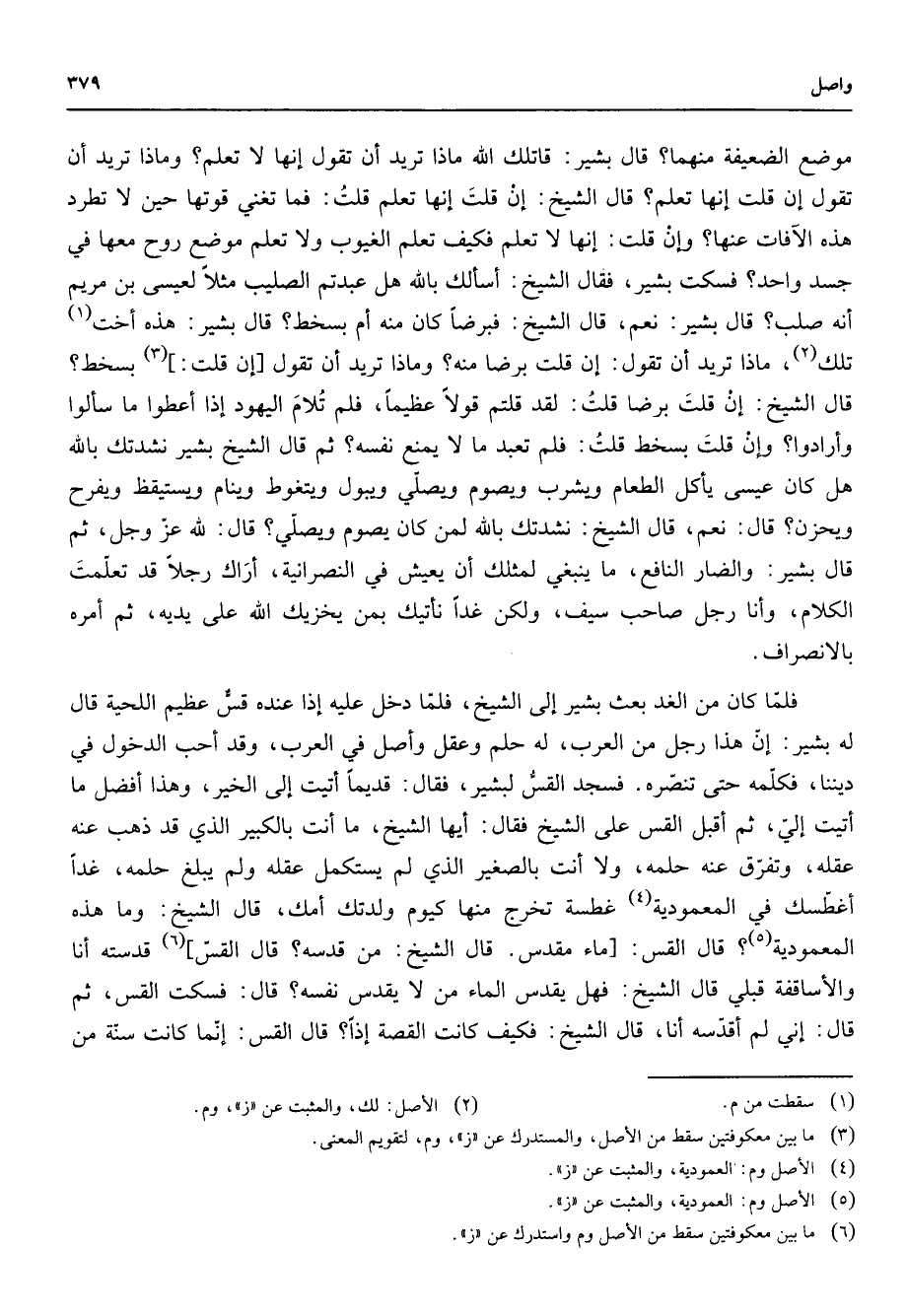 موضع الضعيفة منهما قال بشير قاتلك الله ماذا تريد أن تقول إنها لا تعلم وماذا تريد أن تقول إن قلت إنها تعلم قال الشيخ إن قلت إنها تعلم قلت فما تغني قوتها حين لا تطرد هذه الآفات عنها وإن قلت إنها لا تعلم فكيف تعلم الغيوب ولا تعلم موضع روح معها في جسد واحد فسكت بشير فقال الشيخ أسألك بالله هل عبدتم الصليب مثلا لعيسى بن مريم أنه صلب قال بشير نعم قال الشيخ فبرضا كان منه أم بسخط قال بشير هذه أخت (1) تلك (2) ماذا تريد أن تقول إن قلت برضا منه وماذا تريد أن تقول إن قلت بسخط؟ (3) قال الشيخ إن قلت برضا قلت لقد قلتم قولا عظيما فلم تلام اليهود إذا أعطوا ما سألوا وأرادوا وإن قلت بسخط قلت فلم تعبد ما لا يمنع نفسه ثم قال الشيخ بشير نشدتك بالله هل كان عيسى يأكل الطعام ويشرب ويصوم ويصلي ويبول ويتغوط وينام ويستيقظ ويفرح ويحزن قال نعم قال الشيخ نشدتك بالله لمن كان يصوم ويصلي قال لله عز وجل ثم قال بشير والضار النافع ما ينبغي لمثلك أن يعيش في النصرانية أراك رجلا قد تعلمت الكلام وأنا رجل صاحب سيف ولكن غدا نأتيك بمن يخزيك الله على يديه ثم أمره بالانصراف فلما كان من الغد بعث بشير إلى الشيخ فلما دخل عليه إذا عنده قس عظيم اللحية قال له بشير إن هذا رجل من العرب له حلم وعقل وأصل في العرب وقد أحب الدخول في ديننا فكلمه حتى تنصره فسجد القس لبشير فقال قديما أتيت إلى الخير وهذا أفضل ما أتيت إلي ثم أقبل القس على الشيخ فقال أيها الشيخ ما أنت بالكبير الذي قد ذهب عنه عقله وتفرق عنه حلمه ولا أنت بالصغير الذي لم يستكمل عقله ولم يبلغ حلمه غدا أغطسك في المعمودية (4) غطسة تخرج منها كيوم ولدتك أمك قال الشيخ وما هذه المعمودية (5) قال القس ماء مقدس قال الشيخ من قدسه قال القس (6) قدسته أنا والأساقفة قبلي قال الشيخ فهل يقدس الماء من لا يقدس نفسه قال فسكت القس ثم قال إني لم أقدسه أنا قال الشيخ فكيف كانت القصة إذا قال القس إنما كانت سنة من