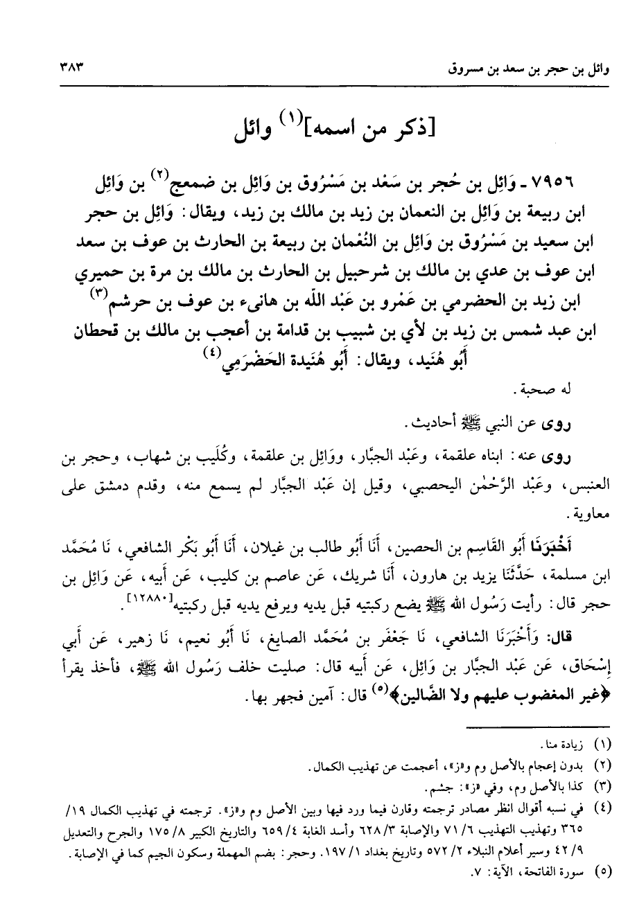 7956 - وائل بن حجر بن سعد بن مسروق بن وائل بن ضمعج (2) بن وائل ابن ربيعة بن وائل بن النعمان بن زيد بن مالك بن زيد ويقال وائل بن حجر ابن سعيد بن مسروق بن وائل بن النعمان بن ربيعة بن الحارث بن عوف بن سعد ابن عوف بن عدي بن مالك بن شرحبيل بن الحارث بن مالك بن مرة بن حميري ابن زيد بن الحضرمي بن عمرو بن عبد الله بن هانئ بن عوف بن حرشم (3) ابن عبد شمس بن زيد بن لأي بن شبيب بن قدامة بن أعجب بن مالك بن قحطان أبو هنيد ويقال أبو هنيدة الحضرمي (4) له صحبة روى عن النبي (صلى الله عليه وسلم) أحاديث روى عنه ابناه علقمة وعبد الجبار ووائل بن علقمة وكليب بن شهاب وحجر بن العنبس وعبد الرحمن اليحصبي وقيل إن عبد الجبار لم يسمع منه وقدم دمشق على معاوية أخبرنا أبو القاسم بن الحصين أنا أبو طالب بن غيلان أنا أبو بكر الشافعي نا محمد ابن مسلمة حدثنا يزيد بن هارون أنا شريك عن عاصم بن كليب عن أبيه عن وائل بن حجر قال رأيت رسول الله (صلى الله عليه وسلم) يضع ركبتيه قبل يديه ويرفع يديه قبل ركبتيه قال وأخبرنا الشافعي نا جعفر بن محمد الصايغ نا أبو نعيم نا زهير عن أبي إسحاق عن عبد الجبار بن وائل عن أبيه قال صليت خلف رسول الله (صلى الله عليه وسلم) فأخذ يقرأ " غير المغضوب عليهم ولا الضالين (5) " قال آمين فجهر بها