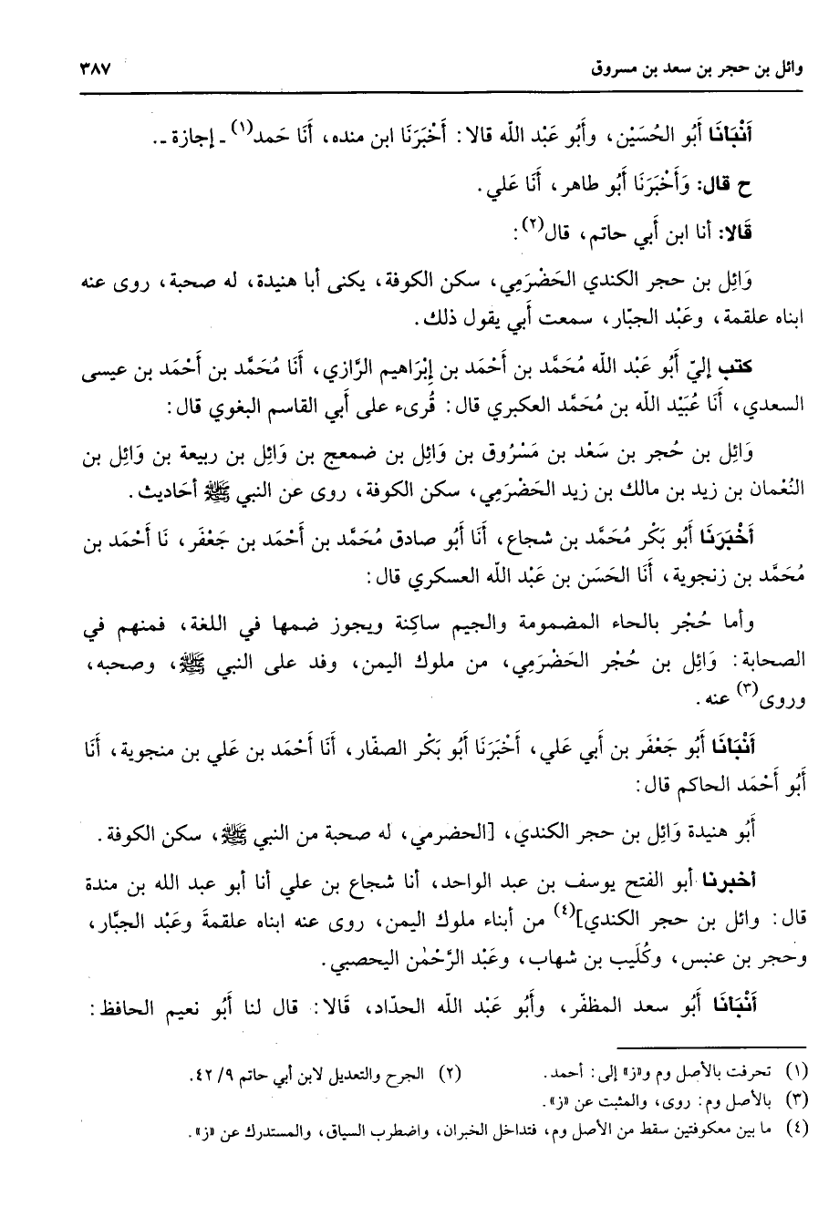 أنبأنا أبو الحسين وابو عبد الله قالا أخبرنا ابن منده أنا (1) حمد إجازة ح قال وأخبرنا أبو طاهر أنا علي قالا أنا ابن أبي حاتم قال (2) وائل بن حجر الكندي الحضرمي سكن الكوفة يكنى أبا هنيدة له صحبة روى عنه ابناه علقمة وعبد الجبار سمعت أبي يقول ذلك كتب إلي أبو عبد الله محمد بن أحمد بن إبراهيم الرازي أنا محمد بن أحمد بن عيسى السعدي أنا عبيد الله بن محمد العكبري قال قرئ على أبي القاسم البغوي قال وائل بن حجر بن سعد بن مسروق بن وائل بن ضمعج بن وائل بن ربيعة بن وائل بن النعمان بن زيد بن مالك بن زيد الحضرمي سكن الكوفة روى عن النبي (صلى الله عليه وسلم) أحاديث أخبرنا أبو بكر محمد بن شجاع أنا أبو صادق محمد بن أحمد بن جعفر نا أحمد بن محمد بن زنجوية أنا الحسن بن عبد الله العسكري قال واما حجر بالحاء المضمومة والجيم ساكنة ويجوز ضمها في اللغة فمنهم في الصحابة وائل بن حجر الحضرمي من ملوك اليمن وفد على النبي (صلى الله عليه وسلم) وصحبه وروى عنه (3) أنبأنا أبو جعفر بن أبي علي أخبرنا أبو بكر الصفار أنااحمد بن علي بن منجوية أنا أبو أحمد الحاكم قال أبو هنيدة وائل بن حجر الكندي الحضرمي له صحبة من النبي (صلى الله عليه وسلم) سكن الكوفة أخبرنا أبو الفتح يوسف بن عبد الواحد أنا شجاع بن علي أنا أبو عبد الله بن مندة قال وائل بن حجر الكندي (4) من ابناء ملوك اليمن روى عنه ابناه علقمة وعبد الجبار وحجر بن عنبس وكليب بن شهاب وعبد الرحمن اليحصبي أنبأنا أبو سعد المظفر وأبو عبد الله الحداد قالا قال لنا أبو نعيم الحافظ