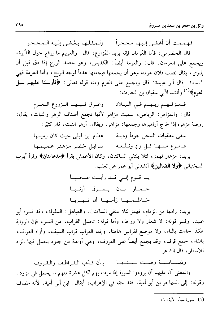 فهممت أن أغشى إليها محجرا * ولمثلها يغشى إليه المحجر * قال الحضرمي فأما العرمان فإنه يريد المزارع قال والعريم ما يرفع حول الدبرة ويجمع على العرمان قال والعرمة أيضا الكديس وهو حصد الزرع إذا دق قبل أن يذرى يقال نصب فلان عرمته وهو أن يجمعها فيجعلها هدفا لوجه الريح وأما العرمة فهي المسناة قال أبو عبيدة قال ويجمع على العرم ومنه قوله تعالى " فأرسلنا عليهم سيل العرم " (1) وأنشد لأبي سفيان بن الحارث فمزقهم ربهم في البلاد * وغرق فيها الزروع العرم * قال والمزاهر الرياض سميت مزاهر لأنها تجمع أصناف الزهر والنبات يقال روضة مزهرة إذا خرج أزاهيرها وجمعها مزاهر ويقال أزهر النبت قال كثير سقى مطفيات المحل جودا وديمة * عظام ابن ليلى حيث كان رميمها فامرع منها كل واد وتلعة * سرابل خضر مزهئر عميمها * بريد مزهار فهمز لئلا يلتقي الساكنان وكان الأعمش يقرأ " مدهامتان " وقرأ أيوب السختياني " ولا الضالين " أنشدني أبو عمر عن ثعلب * يا قوم إني قد رأيت عجبا حمار بان يسرق أرنبا * خاطمها زأمها أن تهربا يريد زامها من الزمام فهمز لئلا يلتقي الساكنان والعباهل الملوك وقد فسره أبو عبيد وفسر قوله لا شغار ولا وراط وأما قوله تحمل القراب من التمر فإن الرواية هكذا جاءت بالباء ولا موضع لقرابين هاهنا وإنما القراب قراب السيف وأراه القراف بالفاء جمع قرف وقد يجمع أيضا على القروف وهي أوعية من جلود يحمل فيها الزاد للأسفار قال الشاعر وذبيانية وصت بينها * بأن كذب القراطف والقروف والمعنى أن عليهم أن يزودوا السرية إذا مرت بهم لكل عشرة منهم ما يحمل في مزود وقوله إلى المهاجر بن أبو أمية فقد حقه في الإعراب أيقال ابن أبي أمية لأنه مضاف