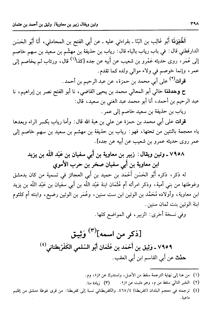 7959 - وثيق بن أحمد بن عثمان أبو السلمي الكفر بطناني (4) حدث عن أبي القاسم ابن أبي العقب