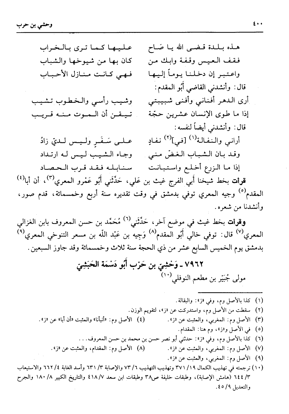 هذه بلدة قضى الله يا صاح * عليها كما ترى بالخراب فقف العيس وقفة وابك من * كان بها من شيوخها والشباب واعتبر إن دخلنا يوما إليها * فهي كانت منازل الأحباب * قال وأنشدني القاضي أبو المقدم أرى الدهر أفناني وافنى شبيبتي * وشيب رأسي والخطوب تشيب إذا ما طوى الإنسان عشرين حجة * تيقن أن الموت منه قريب * قال وأنشدني أيضا لنفسه أراني والنفالة (1) في (2) نفاد * على سفر وليس لوي زاد وقد بان الشباب الغض مني * وجاء الشيب ليس له ارتداد إذا ما الزرع أخلع واستبانت * سنابله فقد قرب الحصاد * قرأت بخط شيخنا أبي الفرج غيث بن علي حدثني أبو عمرو المعري (3) أن أبا (4) المقدم (5) وجيه المعري توفي بدمشق في وقت تقديره سنة أربع وخمسمائة قدم صور وأنشدنا من شعره وقرأت بخط غيث في موضع آخر حدثني (6) محمد بن حسن المعروف بابن الغزالي المعري (7) قال توفي خالي أبو المقدم (8) وجيه بن عبد الله بن مسعر التنوخي المعرى (9) بدمشق يوم الخميس السابع عشر من ذي الحجة سنة ثلاث وخمسمائة وقد جاوز السبعين