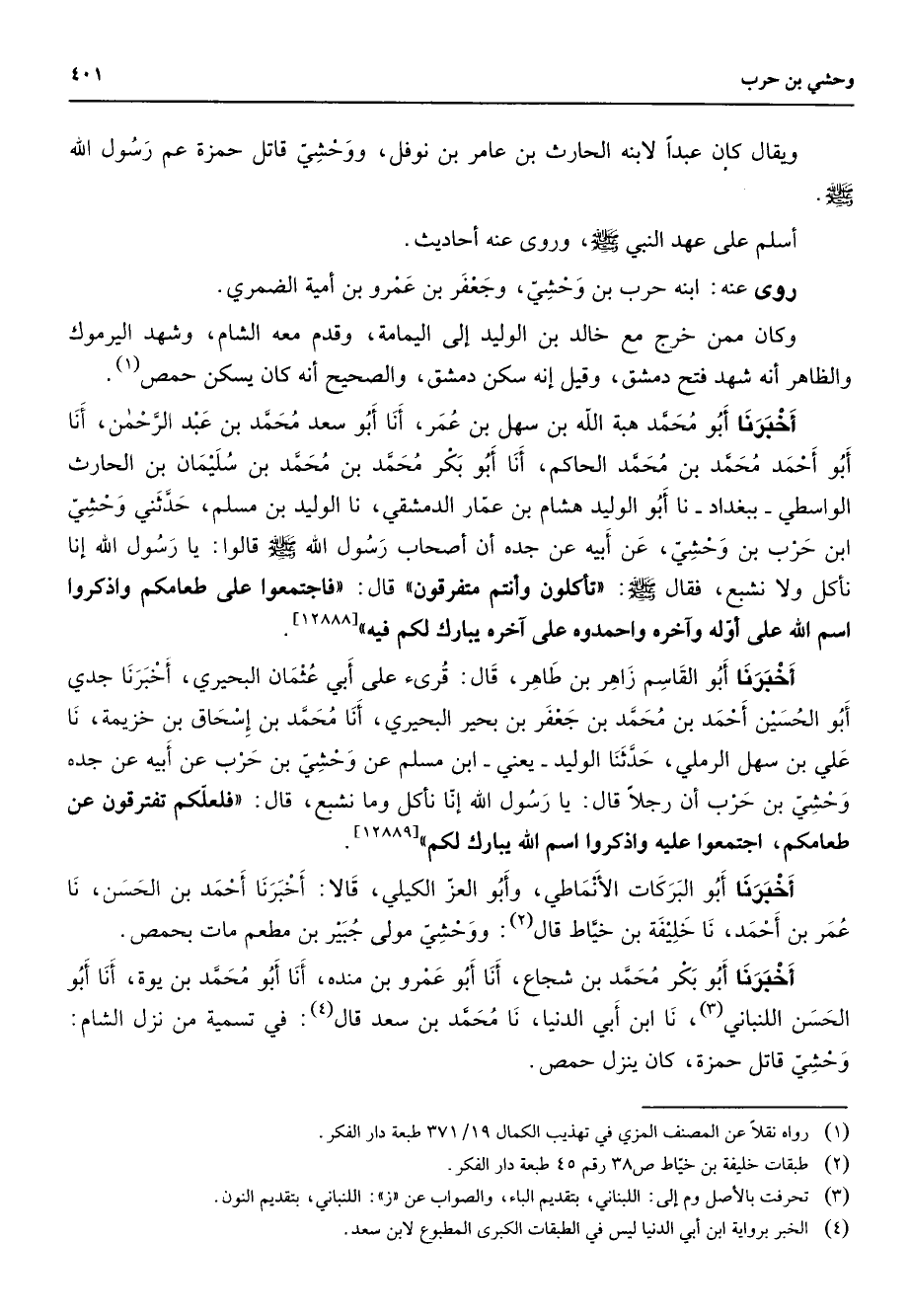ويقال كان عبدا لابنه الحارث بن عامر بن نوفل ووحشي قاتل حمزة عم رسول الله (صلى الله عليه وسلم) أسلم على عهد النبي (صلى الله عليه وسلم) وروى عنه أحاديث روى عنه ابنه حرب بن وحشي وجعفر بن عمرو بن أمية الضمري وكان ممن خرج مع خالد بن الوليد إلى اليمامة وقدم معه الشام وشهد اليرموك والظاهر أنه شهد فتح دمشق وقيل إنه سكن دمشق والصحيح أنه كان يسكن حمص (1) أخبرنا أبو محمد هبة الله بن سهل بن عمر أنا أبو سعد محمد بن عبد الرحمن أنا أبو أحمد محمد بن محمد الحاكم أنا أبو بكر محمد بن محمد بن سليمان بن الحارث الواسطي ببغداد نا أبو الوليد هشام بن عمار الدمشقي نا الوليد بن مسلم حدثني وحشي ابن حرب بن وحشي عن أبيه عن جده أن أصحاب رسول الله (صلى الله عليه وسلم) قالوا يا رسول الله إنا نأكل ولا نشبع فقال (صلى الله عليه وسلم) تأكلون وأنتم متفرقون قال فاجتمعوا على طعامكم واذكروا اسم الله على أوله وآخره واحمدوه على آخره يبارك لكم فيه أخبرنا أبو القاسم زاهر بن طاهر قال قرئ على أبي عثمان البحيري أخبرنا جدي أبو الحسين أحمد بن محمد بن جعفر بن بحير البحيري أنا محمد بن إسحاق بن خزيمة نا علي بن سهل الرملي حدثنا الوليد يعني ابن مسلم عن وحشي بن حرب عن أبيه عن جده وحشي بن حرب أن رجلا قال يا رسول الله إنا نأكل وما نشبع قال فلعلكم تفترقون عن طعامكم اجتمعوا عليه واذكروا اسم الله يبارك لكم أخبرنا أبو البركات الأنماطي وأبو العز الكيلي قالا أخبرنا أحمد بن الحسن نا عمربن احمد نا خليفة بن خياط قال (2) ووحشي مولى جبير بن مطعم مات بحمص أخبرنا أبو بكر محمد بن شجاع أنا أبو عمرو بن منده أنا أبو محمد بن يوة أنا أبو الحسن اللنباني (3) نا ابن أبي الدنيا نا محمد بن سعد قال (4) في تسمية من نزل الشام وحشي قاتل حمزة كان ينزل حمص