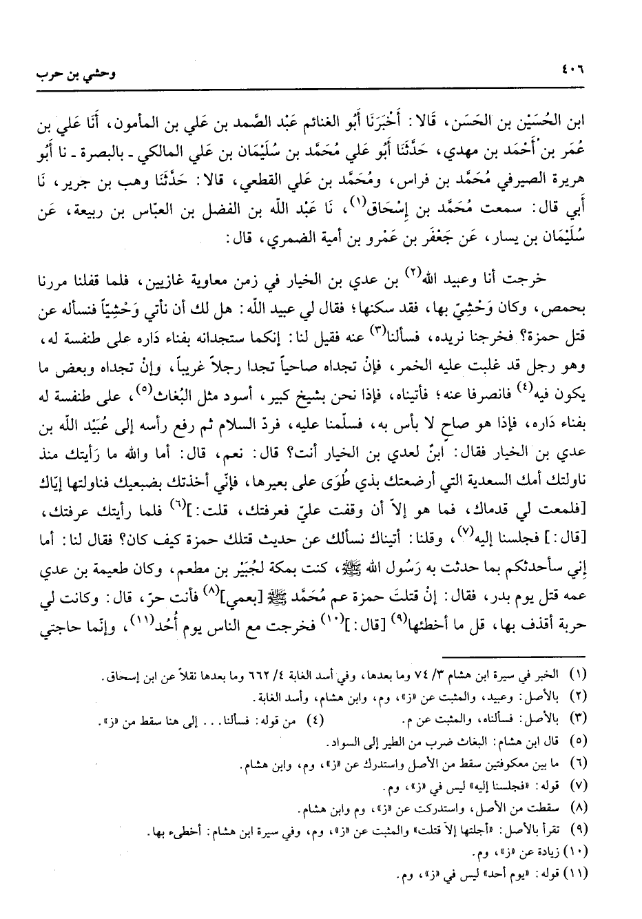 ابن الحسين بن الحسن قالا أخبرنا أبو الغنائم عبد الصمد بن علي بن المأمون أنا علي بن عمربن أحمد بن مهدي حدثنا أبو علي محمد بن سليمان بن علي المالكي بالبصرة نا أبو هريرة الصيرفي محمد بن فراس ومحمد بن علي القطعي قالا حدثنا وهب بن جرير نا أبي قال سمعت محمد بن إسحاق (1) نا عبد الله بن الفضل بن العباس بن ربيعة عن سليمان بن يسار عن جعفر بن عمرو بن أمية الضمري قال خرجت أنا وعبيد الله (2) بن عدي بن الخيار في زمن معاوية غازيين فلما قفلنا مررنا بحمص وكان وحشي بها فقد سكنها فقال لي عبيد الله هل لك أن يأتي وحشيا فنسأله عن قتل حمزة فخرجنا نريده فسألنا (3) عنه فقيل لنا إنكما ستجدانه بفناء داره على طنفسة له وهو رجل قد غلبت عليه الخمر فإن تجداه صاحيا تجدا رجلا غريبا وإن تجداه وبعض ما يكون فيه (4) فانصرفا عنه فأتيناه فإذا نحن بشيخ كبير أسود مثل البغاث (5) على طنفسة له بفناء داره فإذا هو صاح لا بأس به فسلمنا عليه فرد السلام ثم رفع رأسه إلى عبيد الله بن عدي بن الخيار فقال ابن لعدي بن الخيار أنت قال نعم قال أما والله ما رأيتك منذ ناولتك أمك السعدية التي أرضعتك بذي طوى على بعيرها فإني أخذتك بضبعيك فناولتها إياك فلمعت لي قدماك فما هو إلا أن وقفت علي فعرفتك قلت (6) فلما رأيتك عرفتك قال فجلسنا إليه (7) وقلنا أتيناك نسألك عن حديث قتلك حمزة كيف كان فقال لنا أما إني سأحدثكم بما حدثت به رسول الله (صلى الله عليه وسلم) كنت بمكة لجبير بن مطعم وكان طعيمة بن عدي عمه قتل يوم بدر فقال إن قتلت حمزة عم محمد (صلى الله عليه وسلم) بعمي (8) فأنت حر قال وكانت لي حربة أقذف بها قل ما أخطئها (9) قال (10) فخرجت مع الناس يوم أحد وإنما حاجتي
