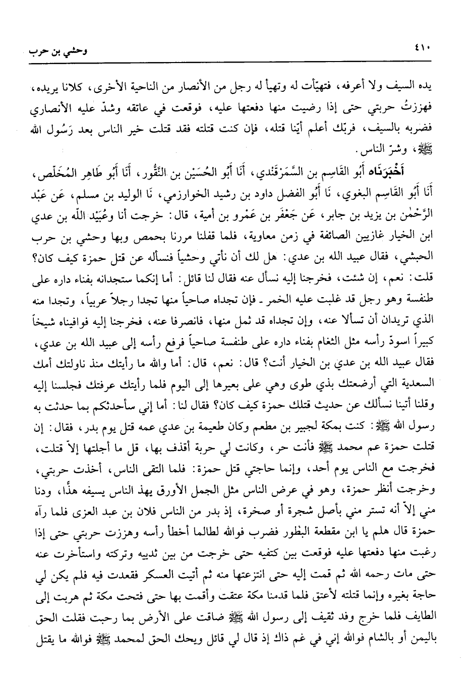 يده السيف ولا أعرفه فتهيأت له وتهيأ له رجل من الأنصار من الناحية الأخرى كلانا يريده فهززت حربتي حتى إذا رضيت منها دفعتها عليه فوقعت في عاتقه وشد عليه الأنصاري فضربه بالسيف فربك أعلم أينا قتله فإن كنت قتلته فقد قتلت خير الناس بعد رسول الله (صلى الله عليه وسلم) وشر الناس أخبرناه أبو القاسم بن السمرقندي أنا أبو الحسين بن النقور أنا أبو طاهر المخلص أنا أبو القاسم البغوي نا أبو الفضل داود بن رشيد الخوارزمي نا الوليد بن مسلم عن عبد الرحمن بن يزيد بن جابر عن جعفر بن عمرو بن أمية قال خرجت أنا وعبيد الله بن عدي ابن الخيار غازيين الصائفة في زمن معاوية فلما قفلنا مررنا بحمص وبها وحشي بن حرب الحبشي فقال عبيد الله بن عدي هل لك أن نأتي وحشيا فنسأله عن قتل حمزة كيف كان قلت نعم إن شئت فخرجنا إليه نسأل عنه فقال لنا قائل أما إنكما ستجدانه بفناء داره على طنفسة وهو رجل قد غلبت عليه الخمر فإن تجداه صاحيا منها تجدا رجلا عربيا وتجدا منه الذي تريدان أن تسألا عنه وإن تجداه قد ثمل منها فانصرفا عنه فخرجنا إليه فوافيناه شيخا كبيرا أسود رأسه مثل الثغام بفناء داره على طنفسة صاحيا فرفع رأسه إلى عبيد الله بن عدي فقال عبيد الله بن عدي بن الخيار أنت قال نعم قال أما والله ما رأيتك منذ ناولتك أمك السعدية التي أرضعتك بذي طوى وهي على بعيرها إلى اليوم فلما رأيتك عرفتك فجلسنا إليه وقلنا أتينا نسألك عن حديث قتلك حمزة كيف كان فقال لنا أناإني سأحدثكم بما حدثت به رسول الله (صلى الله عليه وسلم) كنت بمكة لجبير بن مطعم وكان طعيمة بن عدي عمه قتل يوم بدر فقالإن قتلت حمزة عم محمد (صلى الله عليه وسلم) فأنت حر وكانت لي حربة أقذف بها قل ما أجلتها إلا قتلت فخرجت مع الناس يوم احد وإنما حاجتي قتل حمزة فلما التقى الناس أخذت حربتي وخرجت أنظر حمزة وهو في عرض الناس مثل الجمل الأورق يهذ الناس بسيفه هذا ودنا مني إلا أنه تستر مني بأصل شجرة أو صخرة إذ بدر من الناس فلان بن عبد العزى فلما رآه حمزة قال هلم يا ابن مقطعة البطور فضرب فوالله لطالما أخطأ رأسه وهززت حربتي حتى إذا رغبت منها دفعتها عليه فوقعت بين كتفيه حتى خرجت من بين ثدييه وتركته واستأخرت عنه حتى مات رحمه الله ثم قمت إليه حتى انتزعتها منه ثم أتيت العسكر فقعدت فيه فلم يكن لي حاجة بغيره وإنما قتلته لأعتق فلما قدمنا مكة عتقت وأقمت بها حتى فتحت مكة ثم هربت إلي الطايف فلما خرج وفد ثقيف إلى رسول الله (صلى الله عليه وسلم) ضاقت على الأرض بما رحبت فقلت الحق باليمن أو بالشام فوالله إني في غم ذاك إذ قال لي قائل ويحك الحق لمحمد (صلى الله عليه وسلم) فوالله ما يقتل