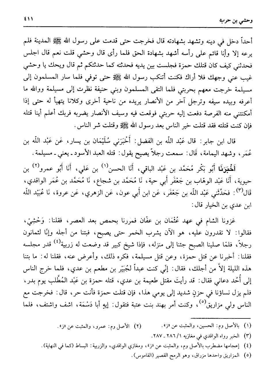 أحدا دخل في دينه وتشهد بشهادته قال فخرجت حتى قدمت على رسول الله (صلى الله عليه وسلم) المدينة فلم يرعه إلا وأنا قائم على رأسه أشهد بشهادة الحق فلما رأى قال وحشي قلت نعم قال اجلس فحدثني كيف كان قتلك حمزة فجلست بين يديه فحدثته كما حدثتكم ثم قال ويحك يا وحشي غيب عني وجهك فلا أراك فكنت أتنكب رسول الله (صلى الله عليه وسلم) حتى توفي فلما سار المسلمون إلى مسيلمة خرجت معهم بحربتي فلما التقى المسلمون وبني حنيفة نظرت إلى مسيلمة ووالله ما أعرفه وبيده سيفه وترجل آخر من الأنصار يريده من ناحية أخرى وكلانا يتهيأ له حتى إذا أمكنتني منه الفرصة دفعت إليه حربتي فوقعت فيه وسيف الأنصار يضربه فربك أعلم أينا قتله فإن كنت قتلته فقد قتلت خير الناس بعد رسول الله (صلى الله عليه وسلم) وقتلت شر الناس قال ابن جابر قال عبد الله بن الفضل أخبرني سليمان بن يسار عن عبد الله بن عمر وشهد اليمامة قال سمعت رجلا يصيح يقول قتله العبد الأسود يعني مسيلمة " أخبرنا أبو بكر محمد بن عبد الباقي أنا الحسن (1) بن علي أنا أبو عمرو (2) بن حيوية أنا عبد الوهاب بن جعفر أبي حية نا محمد بن شجاع نا محمد بن عمر الواقدي قال (3) فحدثني عبد الله بن جعفر عن ابن أبي عون عن الزهري عن عروة نا عبيد الله ابن عدي بن الخيار قال غزونا الشام في عهد عثمان بن عفان فمررنا بحمص بعد العصر فقلنا وحشي فقالوا لا تقدرون عليه هو الآن يشرب الخمر حتى يصبح فبتنا من أجله وإنا لثمانون رجلا فلما صلينا الصبح جئنا إلى منزله فإذا شيخ كبير قد وضعت له زربية (4) قدر مجلسه فقلنا أخبرنا عن قتل حمزة وعن قتل مسيلمة فكره ذلك وأعرض عنه فقلنا له ما بتنا هذه الليلة إلا من أجلك فقال إني كنت عبدا لجبير بن مطعم بن عدي فلما خرج الناس إلى أحد دعاني فقال وقد رأيت مقتل طعيمة بن عدي قتله حمزة بن عبد المطلب يوم بدر فلم يزل نساؤنا في حزن شديد إلى يومي هذا فإن قتلت حمزة فأنت حر قال فخرجت مع الناس ولي مزاريق (5) وكنت أمر بهند بنت عتبة فتقول إيه ابا دسمة اشف واشتف فلما