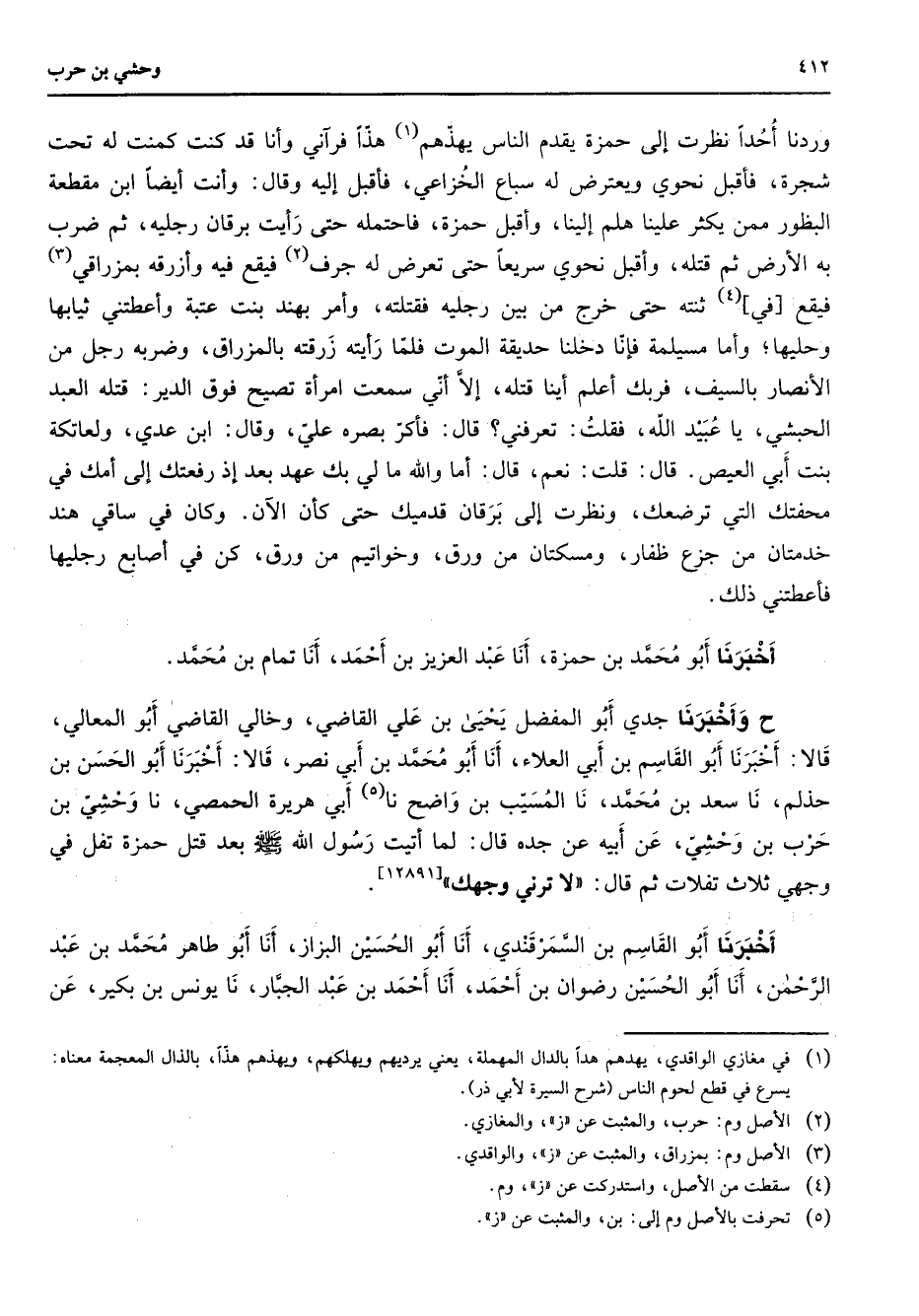 وردنا أحدا نظرت إلى حمزة يقدم الناس يهذهم (1) هذا فرآني وأنا قد كنت كمنت له تحت شجرة فأقبل نحوي ويعترض له سباع الخزاعي فأقبل إليه وقال وأنت أيضا ابن مقطعة البظور ممن يكثر علينا هلم إلينا وأقبل حمزة فاحتمله حتى رأيت برقان رجليه ثم ضرب به الأرض ثم قتله وأقبل نحوي سريعا حتى تعرض له جرف (2) فيقع فيه وأزرقه بمزراقي (3) فيقع في (4) ثنته حتى خرج من بين رجليه فقتلته وأمر بهند بنت عتبة وأعطتني ثيابها وحليها وأما مسيلمة فإنا دخلنا حديقة الموت فلما رأيته زرقته بالمزراق وضربه رجل من الأنصار بالسيف فربك أعلم أينا قتله إلا أني سمعت امرأة تصيح فوق الدير قتله العبد الحبشي يا عبيد الله فقلت تعرفني قال فأكر بصره علي وقال ابن عدي ولعاتكة بنت أبي العيص قال قلت نعم قال أما والله ما لي بك عهد بعد إذ رفعتك إلى أمك في محفتك التي ترضعك ونظرت إلى برقان قدميك حتى كأن الآن وكان في ساقي هند خدمتان من جزع ظفار ومسكتان من ورق وخواتيم من ورق كن في أصابع رجليها فأعطتني ذلك أخبرنا أبو محمد بن حمزة أنا عبد العزيز بن أحمد أنا تمام بن محمد ح وأخبرناجدي أبو المفضل يحيى بن علي القاضي وخالي القاضي أبو المعالي قالا أخبرنا أبو القاسم بن أبي العلاء أنا أبو محمد بن أبي نصر قالا أخبرنا أبو الحسن بن حذلم نا سعد بن محمد نا المسيب بن واضح نا (5) أبي هريرة الحمصي نا وحشي بن حرب بن وحشي عن أبيه عن جده قال لما أتيت رسول الله (صلى الله عليه وسلم) بعد قتل حمزة تفل في وجهي قلاق ثلات ثم قال لا ترني وجهك أخبرنا أبو القاسم بن السمرقندي أنا أبو الحسين البزاز أنا أبو طاهر محمد بن عبد الرحمن أنا أبو الحسين رضوان بن أحمد أنا أحمد بن عبد الجبار نا يونس بن بكير عن