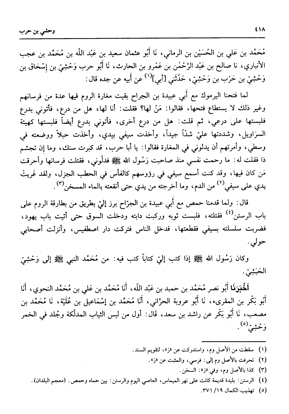 محمد بن علي بن الحسين بن الرماني نا أبو عثمان سعيد بن عبد الله بن محمد بن عجب الأنباري نا صالح بن عبد الرحمن بن عمرو بن الحارث نا أبو حرب وحشي بن إسحاق بن وحشي بن حرب بن وحشي حدثني أبي (1) عن أبيه عن جده قال لما فتحنا اليرموك مع أبي عبيدة بن الجراح بقيت مغارة الروم فيها عدة من فرسانهم وغير ذلك لا يستطاع فتحها فقالوا من لها فقلت أنالها هل من درع فأتوني بدرع فلبستها على درعي ثم قلت هل من درع أخرى فاتوني بدرع أيضا فلبستها كهيئة السراويل وشددتها علي شدا جيدا وأخذت سيفي بيدي وأخذت حبلا ووضعته في وسطي وأمرتهم أن يدلوني في المغارة فقالوا يا أبا حرب قد كبرت سنك وما إن تجشم ذا فقلت له ما رحمت نفسي منذ صاحبت رسول الله (صلى الله عليه وسلم) فدلوني فقتلت فرسانها وأحرقت من كان فيها وقد كنت أسمع سيفي في رؤوسهم كالفأس في الحطب الجزل ولقد غريت يدي على سيفي (2) من الدم وما أخرجته من يدي حتى أنقعته بالماء المسخن (3) قال ولما قدمنا حمص مع أبي عبيدة بن الجراح برز إلي بطريق من بطارقة الروم على باب الرستن (4) فقتلته فلبست ثوبه وركبت دابته ودخلت السوق حتى أتيت باب يهود فضربت سلسلته بسيفي فقطعتها فدخل الناس فتركت دار اصطفيس وانزلت أصحابي حولي وكان رسول الله (صلى الله عليه وسلم) إذا كتب إلي كتابا كتب فيه من محمد النبي (صلى الله عليه وسلم) إلى وحشي الحبشي أخبرنا أبو نصر محمد بن حميد بن عبد الله أنا محمد بن علي بن محمد النحوي أنا أبو بكر بن المقرئ نا أبو عروبة الحراني أنا محمد بن إسماعيل بن علية نا محمد بن مصعب نا أبو بكر عن راشد بن سعد قال اول من لبس الثياب المدلكة وجلد في الخمر وحشي (5)