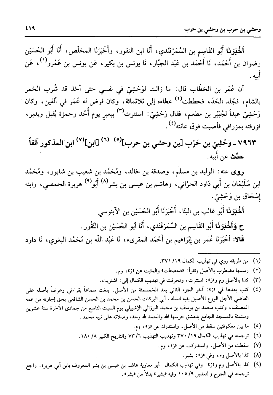 7963 - وحشي بن حرب بن وحشي بن حرب (5) (6) ابن (7) ابن المذكور آنفا حدث عن أبيه روى عنه الوليد بن مسلم وصدقة بن خالد ومحمد بن شعيب بن شابور ومحمد ابن سليمان بن أبي داود الحراني وهاشم بن عيسى بن بشر (8) أبو (9) هريرة الحمصي وابنه إسحاق بن وحشي أخبرنا أبو غالب بن البنا أخبرنا أبو الحسين بن الآبنوسي ح وأخبرنا أبو القاسم بن السمرقندي أنا أبو الحسين بن النقور قالا أخبرنا عمر بن إبراهيم بن أحمد المقرئ نا عبد الله بن محمد البغوي
