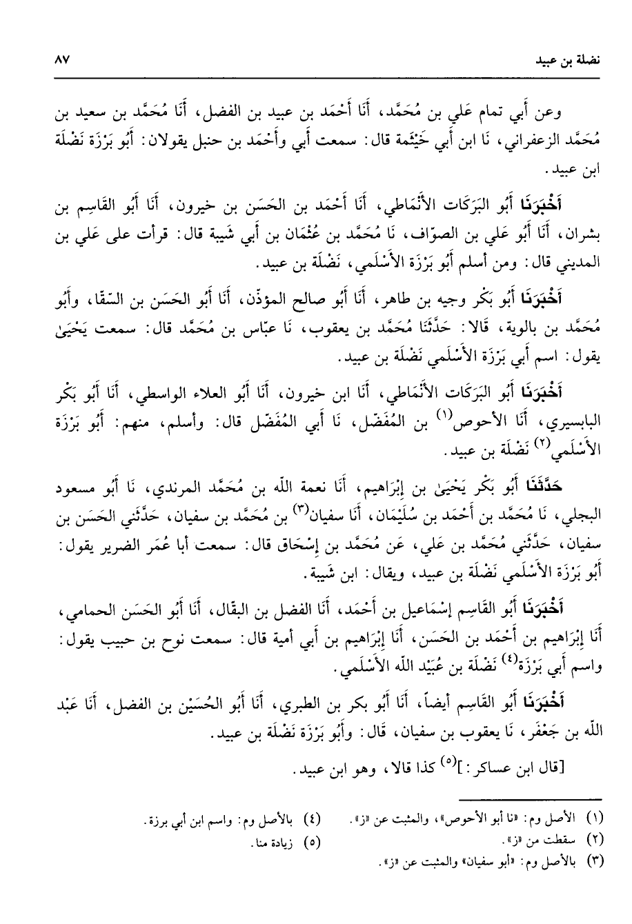 وعن أبي تمام علي بن محمد أنا أحمد بن عبيد بن الفضل أنا محمد بن سعيد بن محمد الزعفراني نا ابن أبي خيثمة قال سمعت أبي وأحمد بن حنبل يقولان أبو برزة نضلة ابن عبيد أخبرنا أبو البركات الأنماطي أنا أحمد بن الحسن بن خيرون أنا أبو القاسم بن بشران أنا أبو علي بن الصواف نا محمد بن عثمان بن أبي شيبة قال قرأت على علي بن المديني قال ومن أسلم أبو برزة الأسلمي نضلة بن عبيد أخبرنا أبو بكر وجيه بن طاهر أنا أبو صالح المؤذن أنا أبو الحسن بن السقا وأبو محمد بن بالوية قالا حدثنا محمد بن يعقوب نا عباس بن محمد قال سمعت يحيى يقول اسم أبي برزة الأسلمي نضلة بن عبيد أخبرنا أبو البركات الأنماطي أنا ابن خيرون أنا أبو العلاء الواسطي أنا أبو بكر البابسيري انا الأحوص (1) بن المفضل نا أبي المفضل قال وأسلم منهم أبو برزة الأسلمي (2) نضلة بن عبيد حدثنا أبو بكر يحيى بن إبراهيم أنا نعمة الله بن محمد المرندي نا أبو مسعود البجلي نا محمد بن أحمد بن سليمان أنا سفيان (3) بن محمد بن سفيان حدثني الحسن بن سفيان حدثني محمد بن علي عن محمد بن إسحاق قال سمعت أبا عمر الضرير يقول أبو برزة الأسلمي نضلة بن عبيد ويقال ابن شيبة أخبرنا أبو القاسم إسماعيل بن أحمد أنا الفضل بن البقال أنا أبو الحسن الحمامي أنا إبراهيم بن أحمد بن الحسن أنا إبراهيم بن أبي أمية قال سمعت نوح بن حبيب يقول واسم أبي برزة (4) نضلة بن عبيد الله الأسلمي أخبرنا أبو القاسم أيضا أنا أبو بكر بن الطبري أنا أبو الحسين بن الفضل أنا عبد الله بن جعفر نا يعقوب بن سفيان قال وأبو برزة نضلة بن عبيد قال ابن عساكر: (5) كذا قالا وهو ابن عبيد